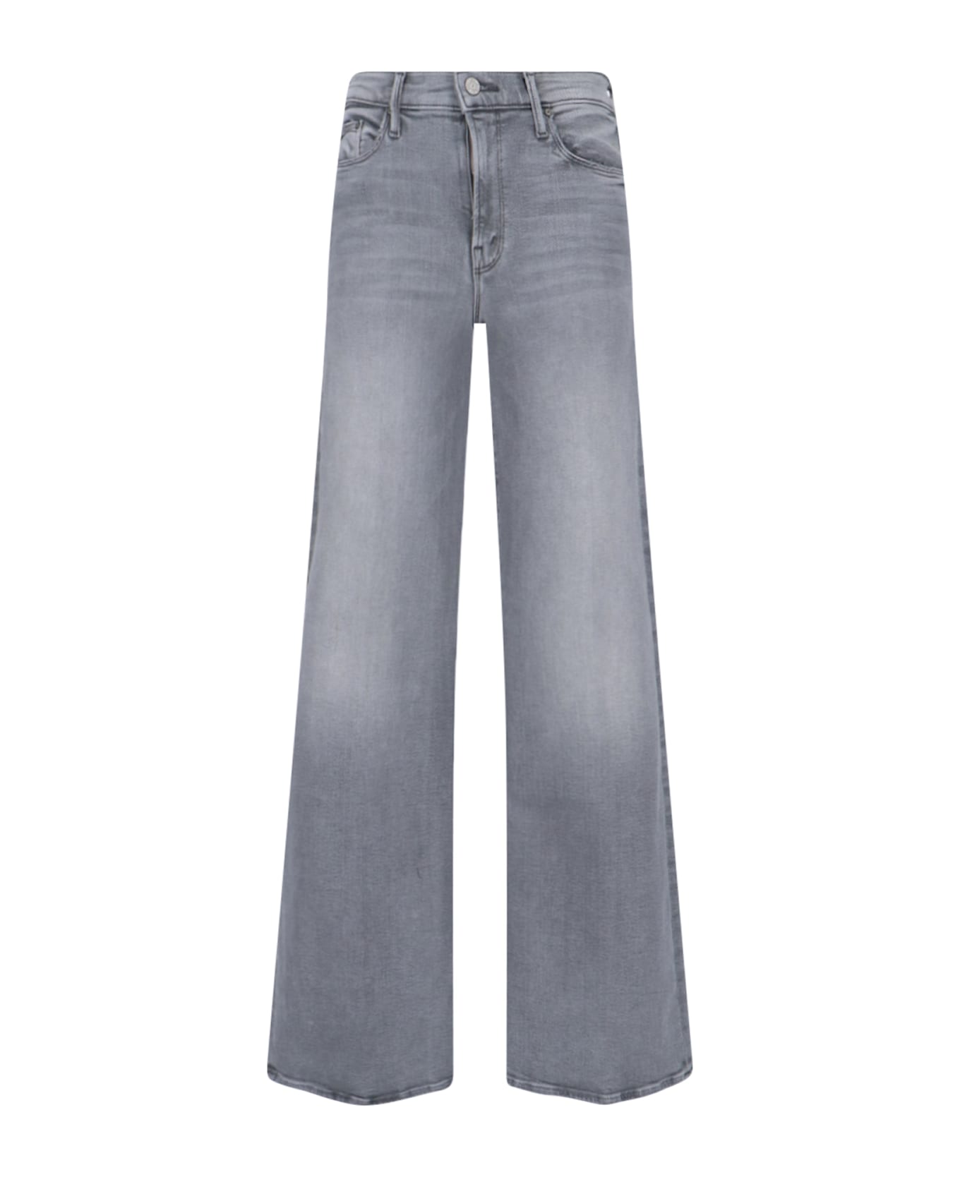 Mother 'The Twister Heel' jeans in grey cotton denim with distressed wash, high waist, belt loops, five-pocket design, button and zip closure, back logo patch, 'M' logo stitching on back pockets, straight leg.
