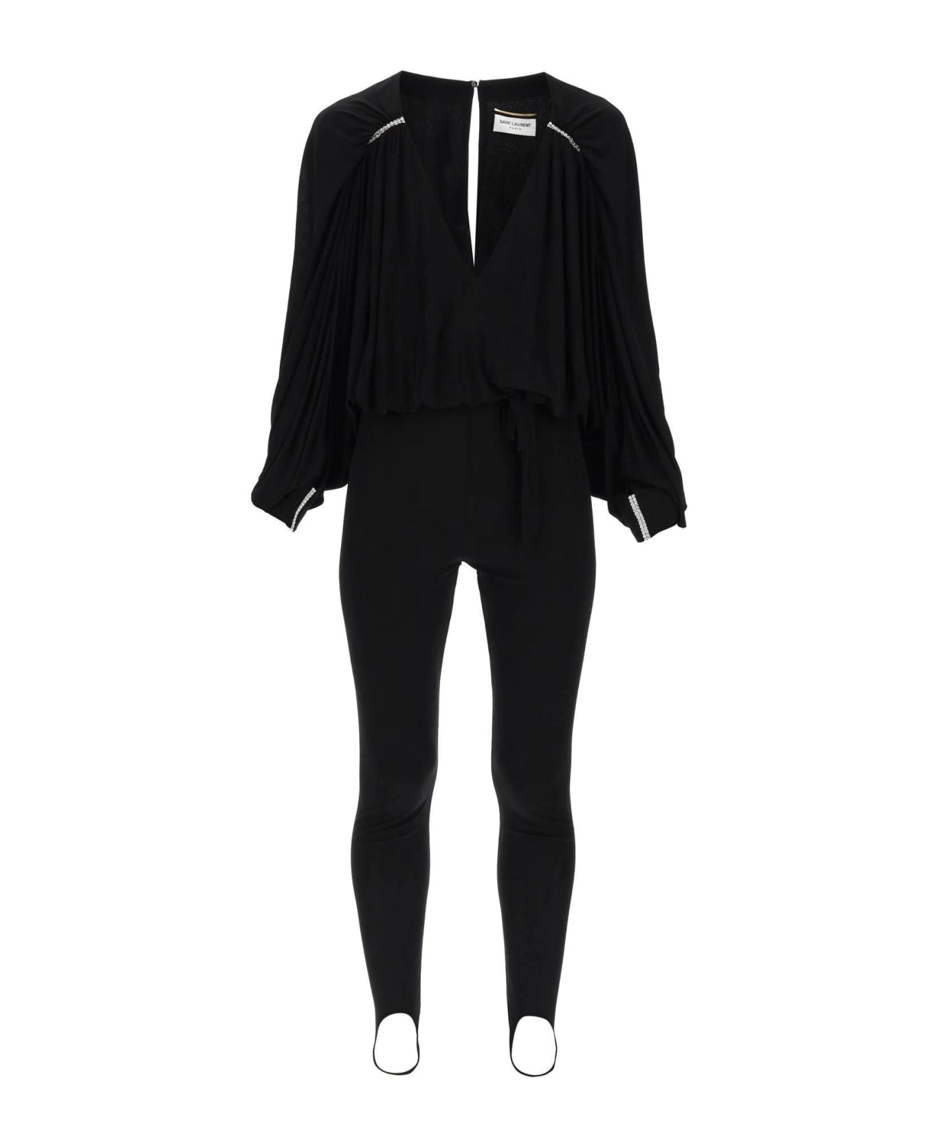 Saint Laurent jumpsuit in lightweight viscose crepe jersey, featuring a loose top with deep V-neck, wide dolman sleeves with front openings and crystals on cuffs and shoulders. Complemented by fitted pants with elastic stirrups at the hem and a tie belt. Teardrop closure on the back with internal button. The model is 177 cm tall and wears a size 1. Composition: 100% Viscose