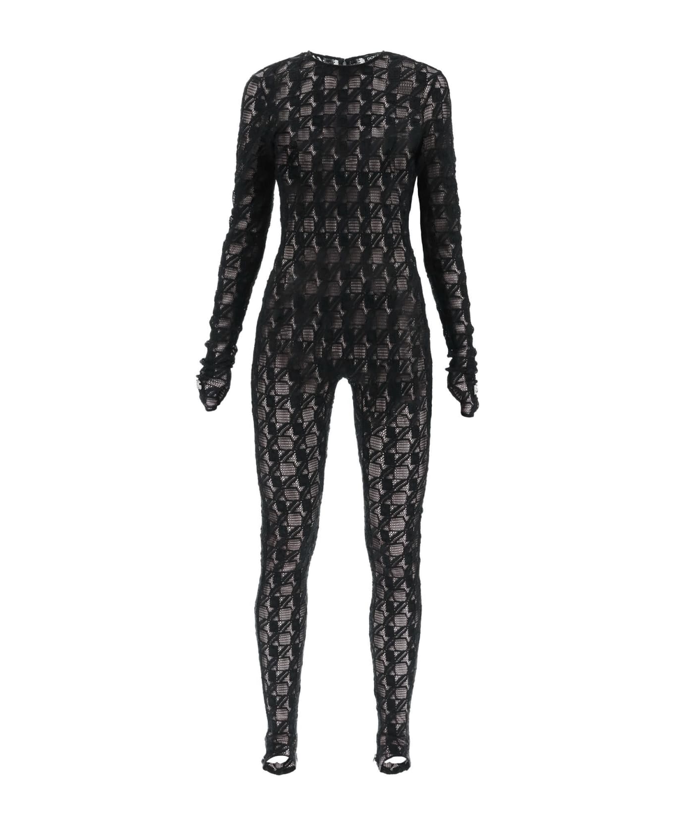 Dolce & Gabbana crew neck jumpsuit in stretch lace for a second skin effect, featuring extra long sleeves with thumbholes and a metal DG logo detail on both cuffs. Bottom with foot provided with invisible zip opening for a double wearing option. The model is 177 cm tall and wears a size IT 40.