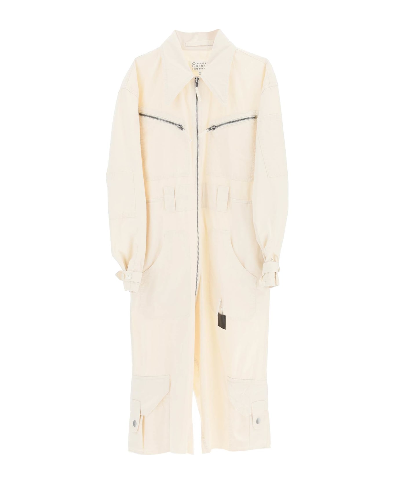 Workwear-inspired playsuit by Maison Margiela, crafted in pure cotton with an oversized fit. It features a shirt collar, zip front, long sleeves with adjustable cuff straps, raw-cut hem. Six pockets, pen pocket on the sleeve, belt loops. Signature four-stitches moniker on the upper back. The model is 177 cm tall and wears a size IT 40.