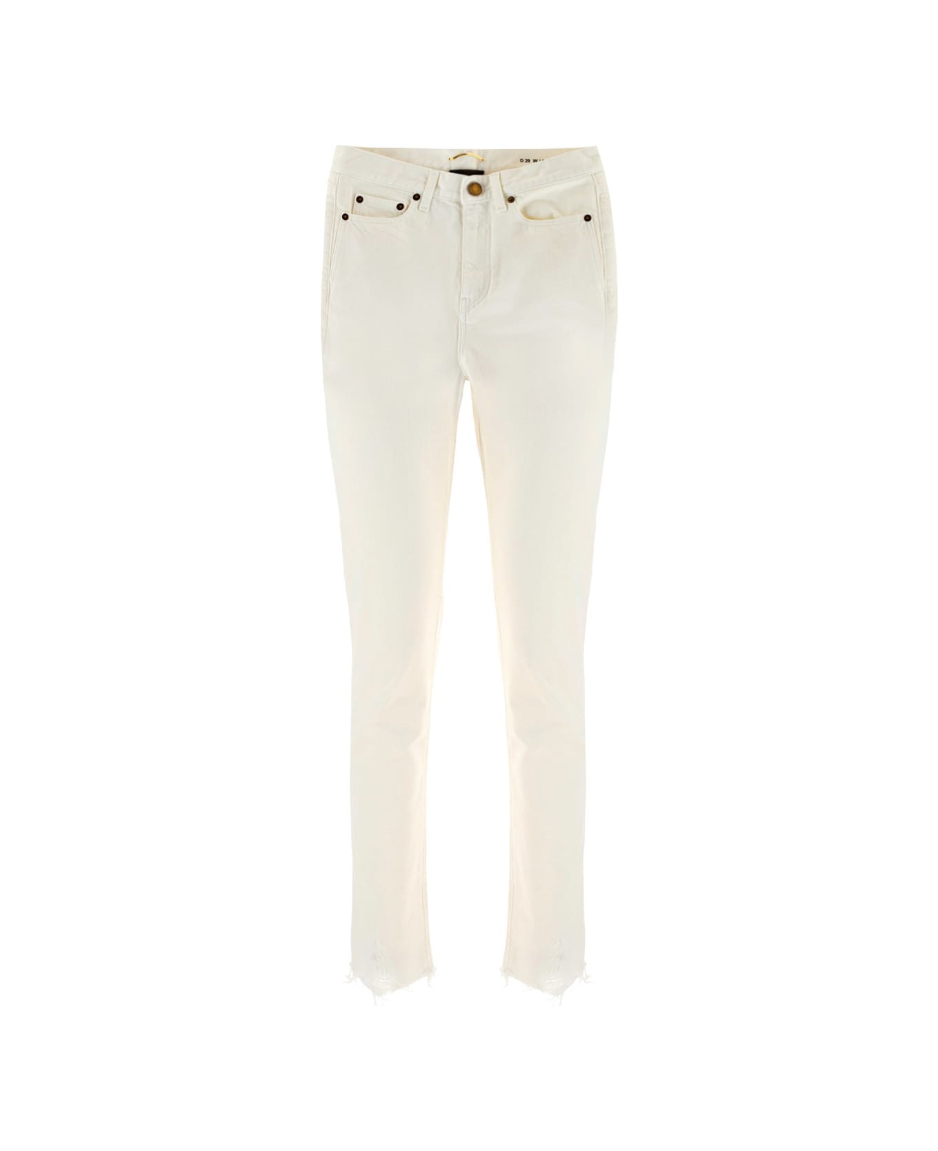 Cotton carrot jeans by saint laurent, five-pocket straight style, frayed leg hem, front button and zipper closure, waist loops, contrasting embossed applique tag at back with brand signature. Composition: 100% % Cotton