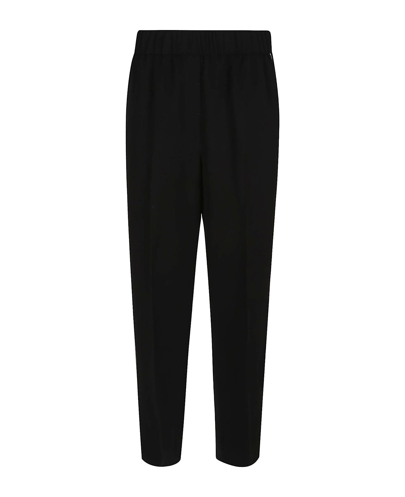 Trousers in light stretch cotton satin by PESERICO. Slightly raised elasticated waist; crease ironing; cigarette design. Embellished with elegant jewelery along the sides.