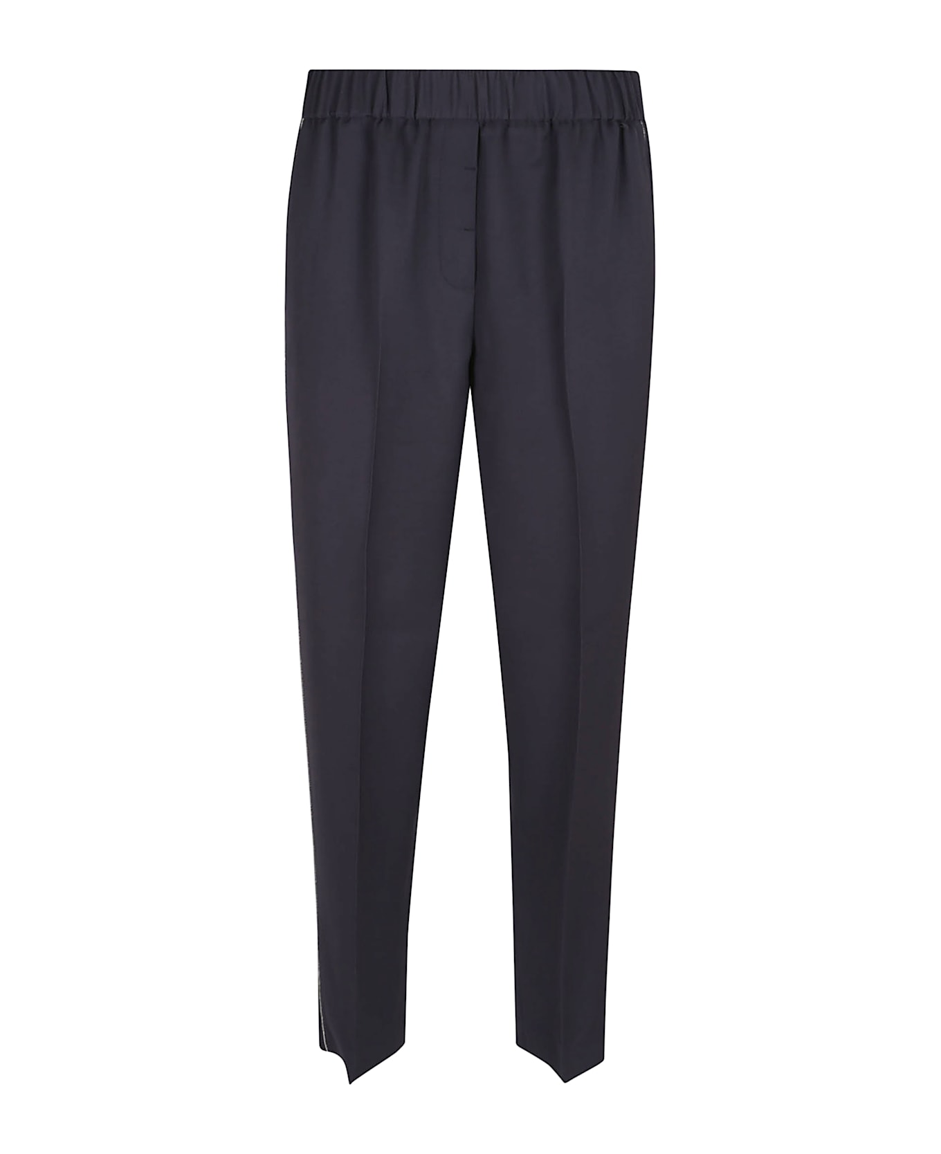 Trousers in light stretch cotton satin by PESERICO. Slightly raised elasticated waist; crease ironing; cigarette design. Embellished with elegant jewelery along the sides.