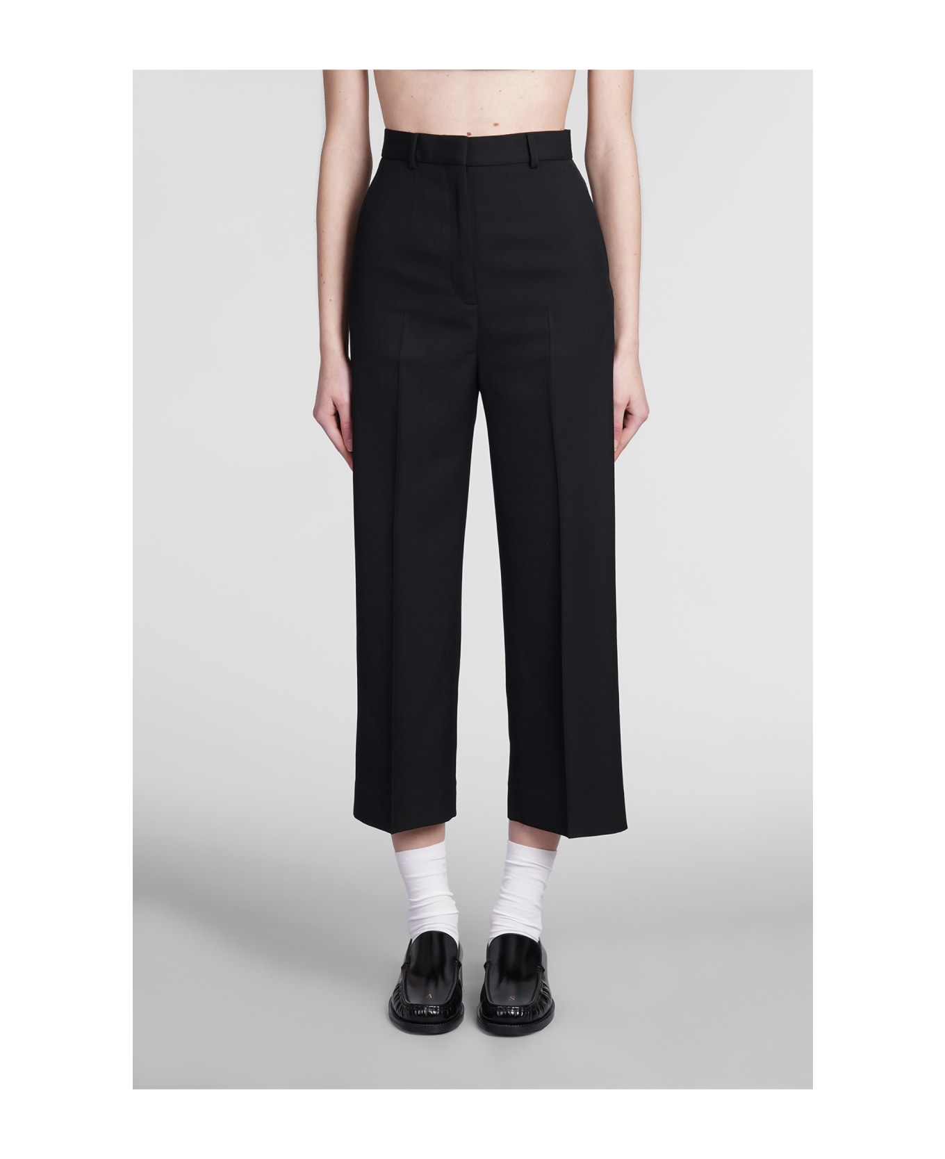 Pants in black polyester, crop cut, high waist, zip clousure, waist belt loops, four pockets, 55% polyester, 45% wool, Made in Portugal, Model is 180 cm and wears size 34