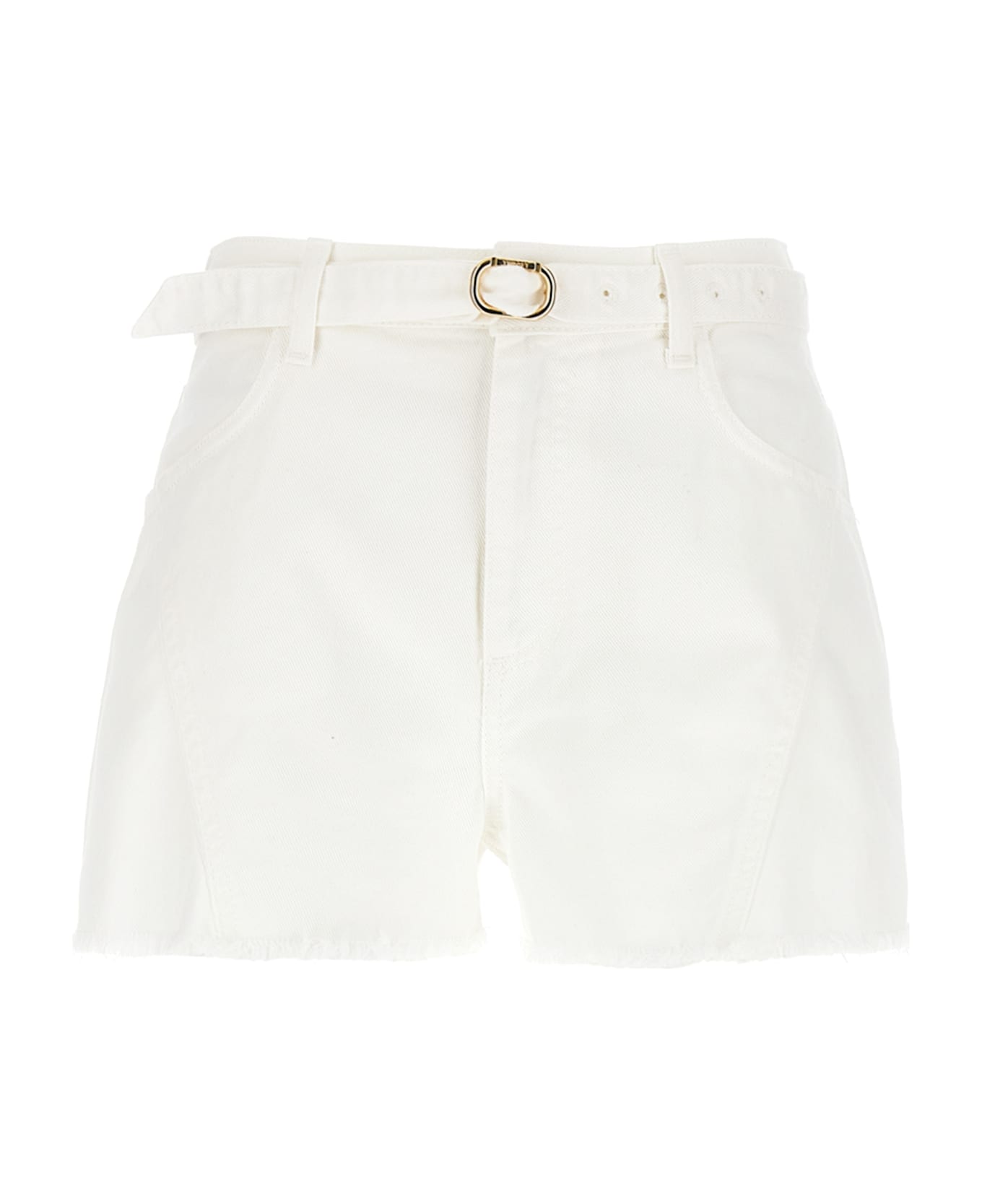 White stretch cotton bull shorts with raw-cut leg bottoms, adjustable and removable metal 'Oval T' buckle belt, zip and button closure, pockets.