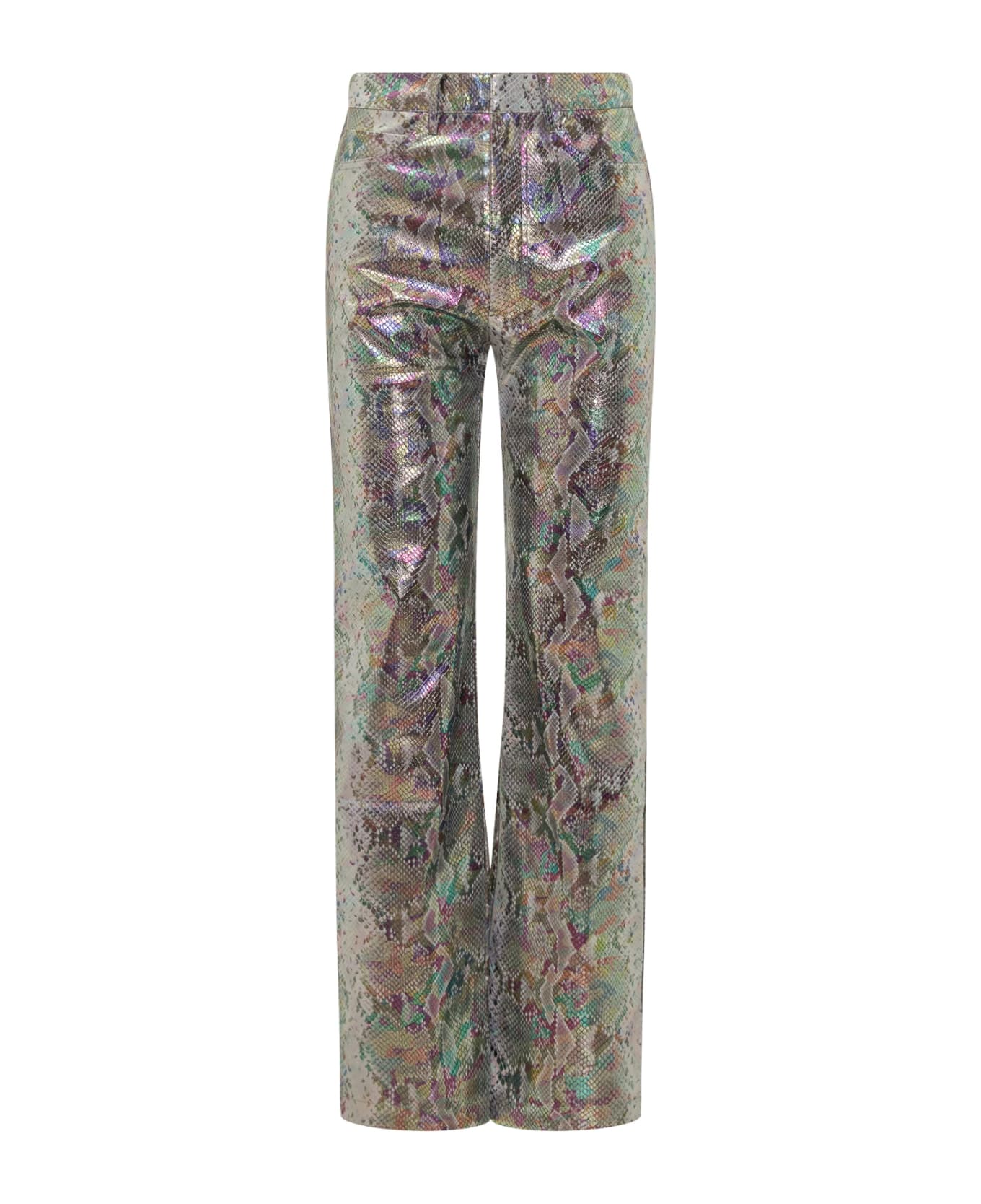 Long pants. Straight fit. Zip and hook closure. Belt loops. Five pockets. Holographic all-over python pattern.