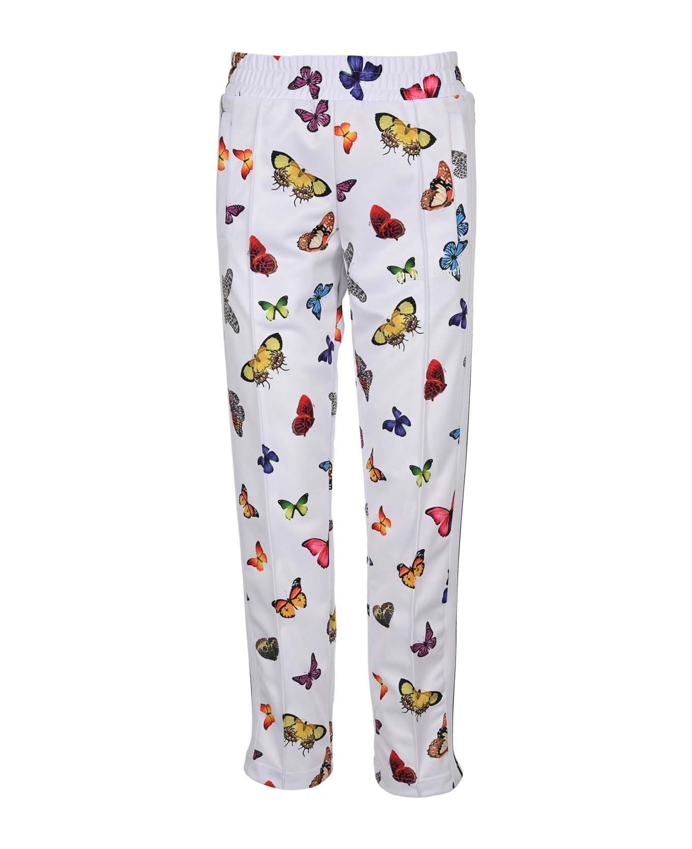 White All Over Printed Track Pants Featuring: - High Waist - All Over Coloured Butterfly Print - Elasticated Waistband - Side Slit Pockets, - Straight Leg, - Zipped Ankles - Piped Stripe To Each Leg.