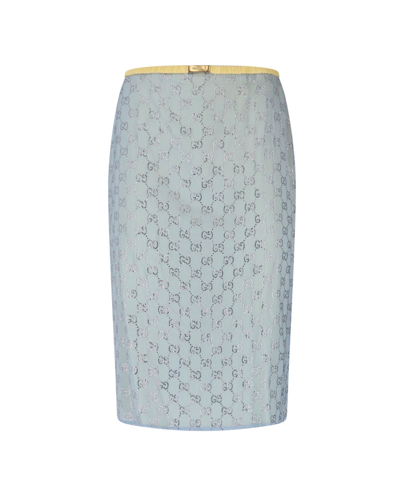 Gucci sheath skirt in light blue GG silk with low waist, contrasting yellow stretch with gold metal hardware detail on the front, back zipper closure, and straight hem. Composition: 100% Silk