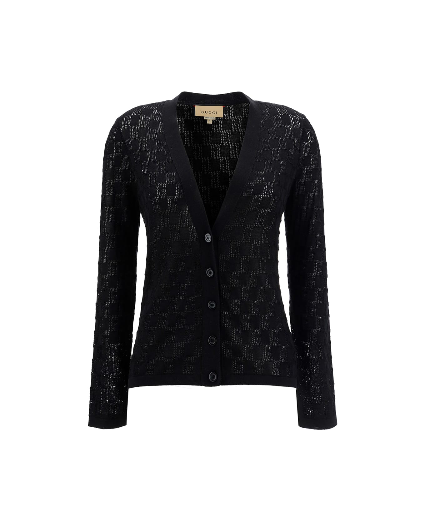 Silk cardigan by gucci, button front closure, ribbed cuffs, ribbed front v-neck, ribbed hem, knit design, iconic gg logo jacquard pattern, regular fit. Composition: 41% % Cotton, 59% % Silk