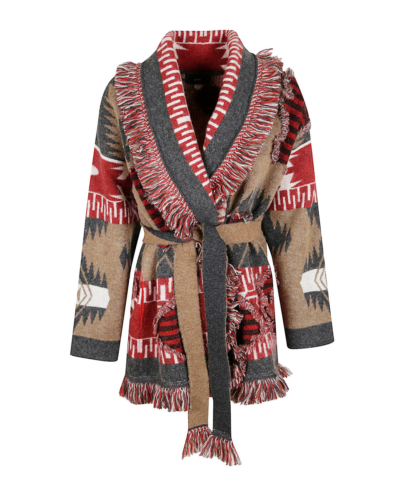 Grunge Anthem cardigan in a soft alpaca and wool blend by ALANUI. Two-tone belt and multicolored fringe trim with contrasting striped inserts and fil coupé details. In Seattle, drawing inspiration from the city`s rich musical tradition for Grunge Anthem.