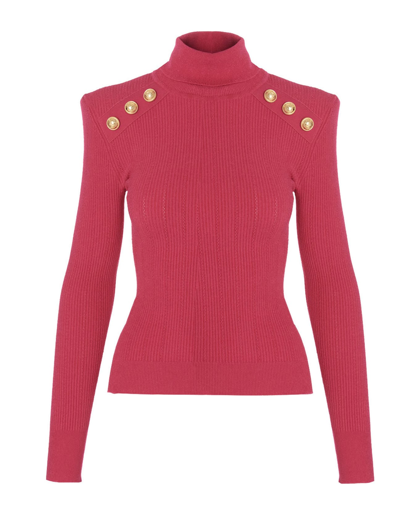 Ribbed stretch fabric turtleneck sweater with a logo button appliqué, a high collar and long sleeves. Composition: 83% viscose 17% pb