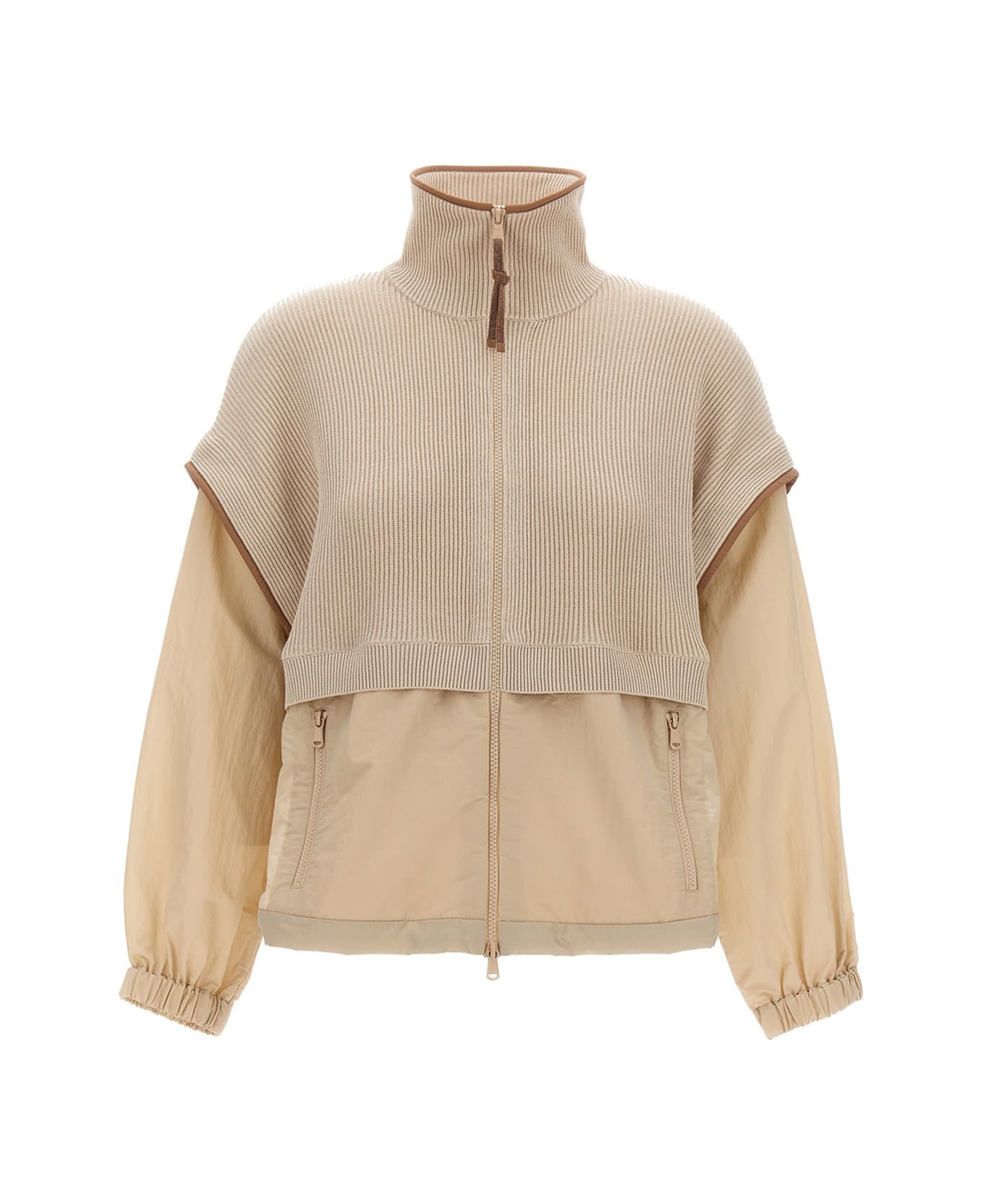 Ribbed cotton knit cardigan with nylon inserts, high neck, zip closure, pockets, long elasticated cuffed sleeves. Composition: 100% cotton