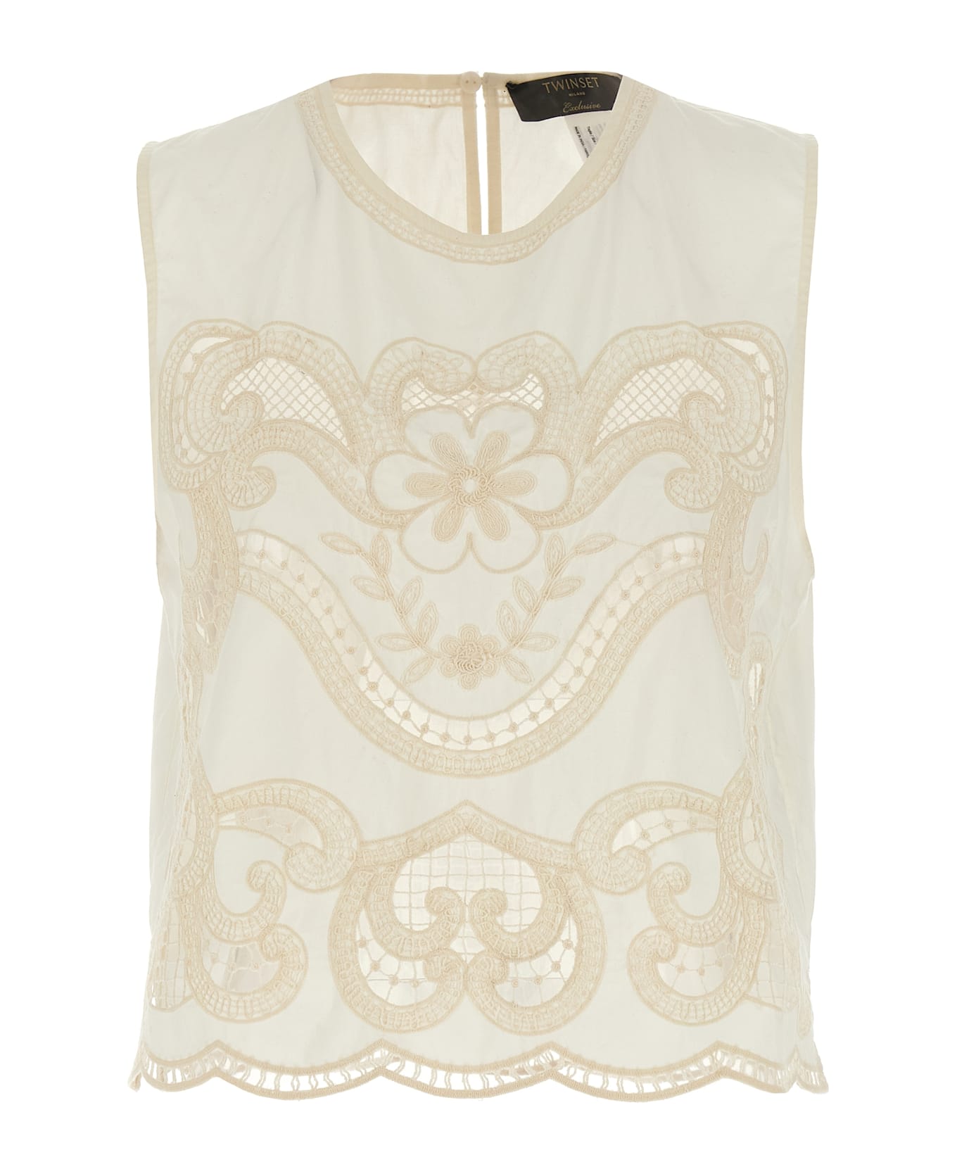 Cotton top with embroidery à jour placed, crew neck, back button closure with cut-out teardrop detail and metal logo application, scalloped hem.