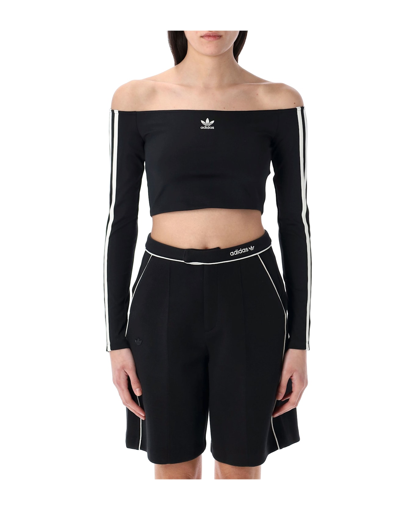 Adicolor Off-shoulder Long Sleeve Top By Adidas Originals. Featuring: Off-shoulder Neckline Three-stripes Appliqué Along The Sleeves Cropped Slim Fit Model Is 1,70 M And Wears Size S