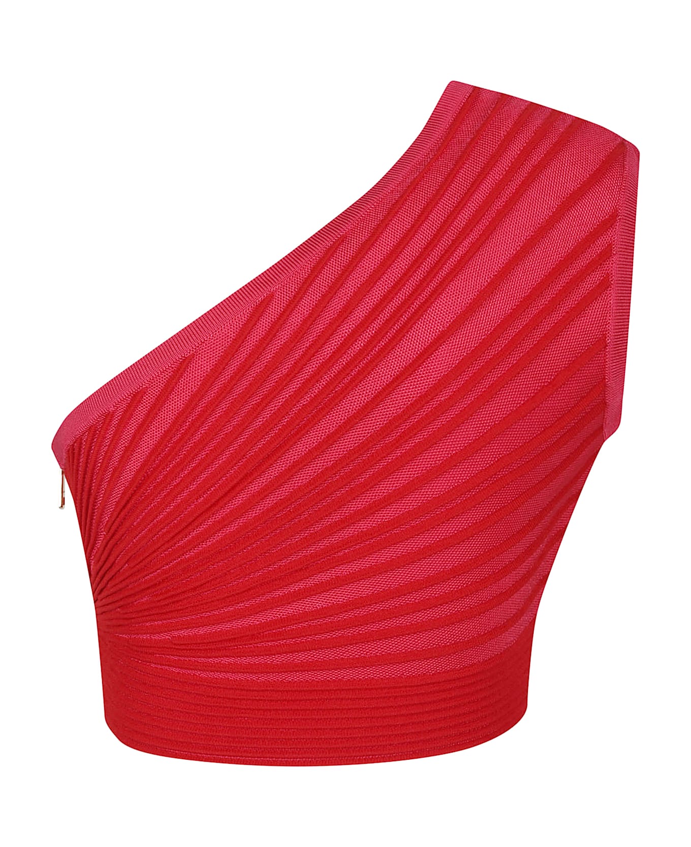 Knit top by BALMAIN. Asymmetric shoulder strap; exposed gold metal zip fastening at side, Balmain Paris engraved slider; cropped and fitted design. Features contrasting ribbed trim.