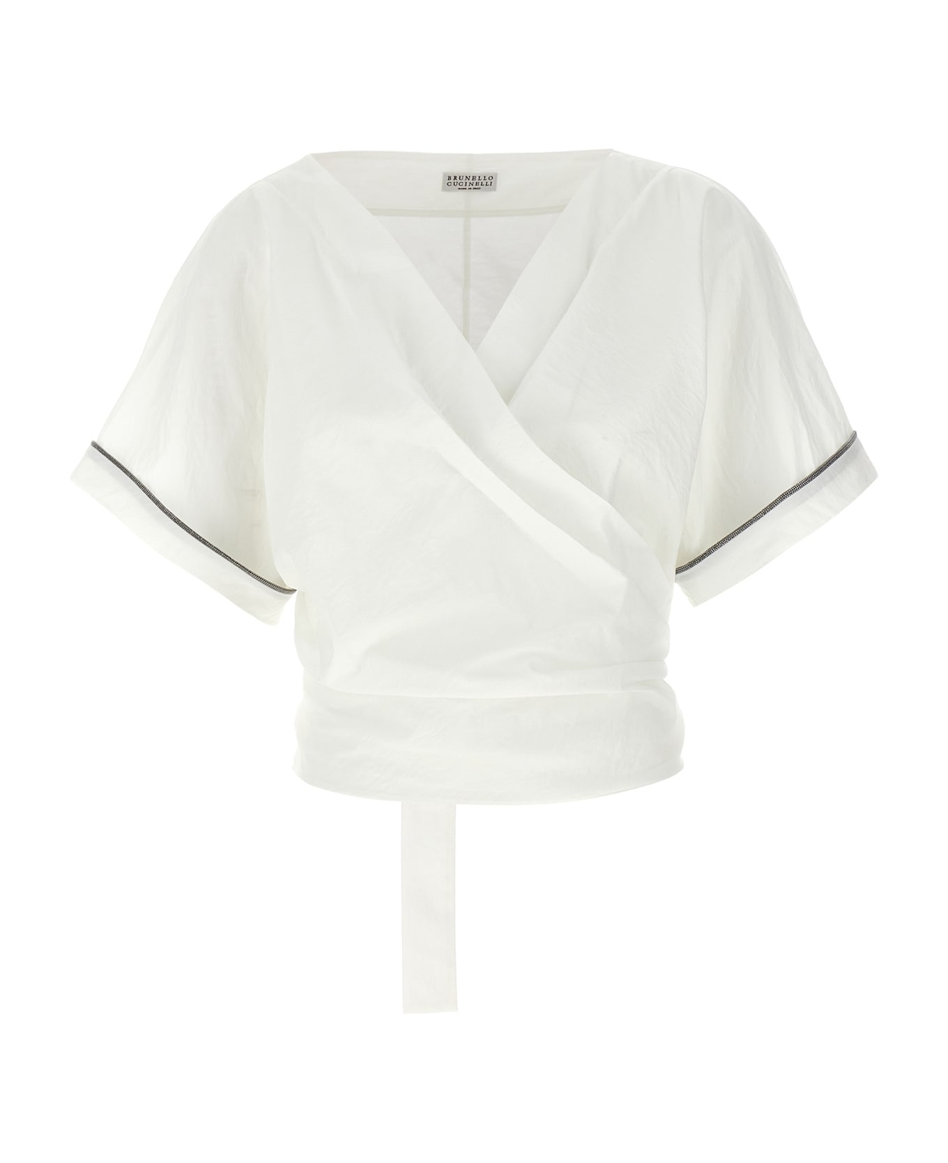 Kimono top in techno cotton poplin with wrap closure with pull belt, wide short sleeves with 'Shiny Trims' Monile detail. Composition: 75% cotton, 25% polyamide