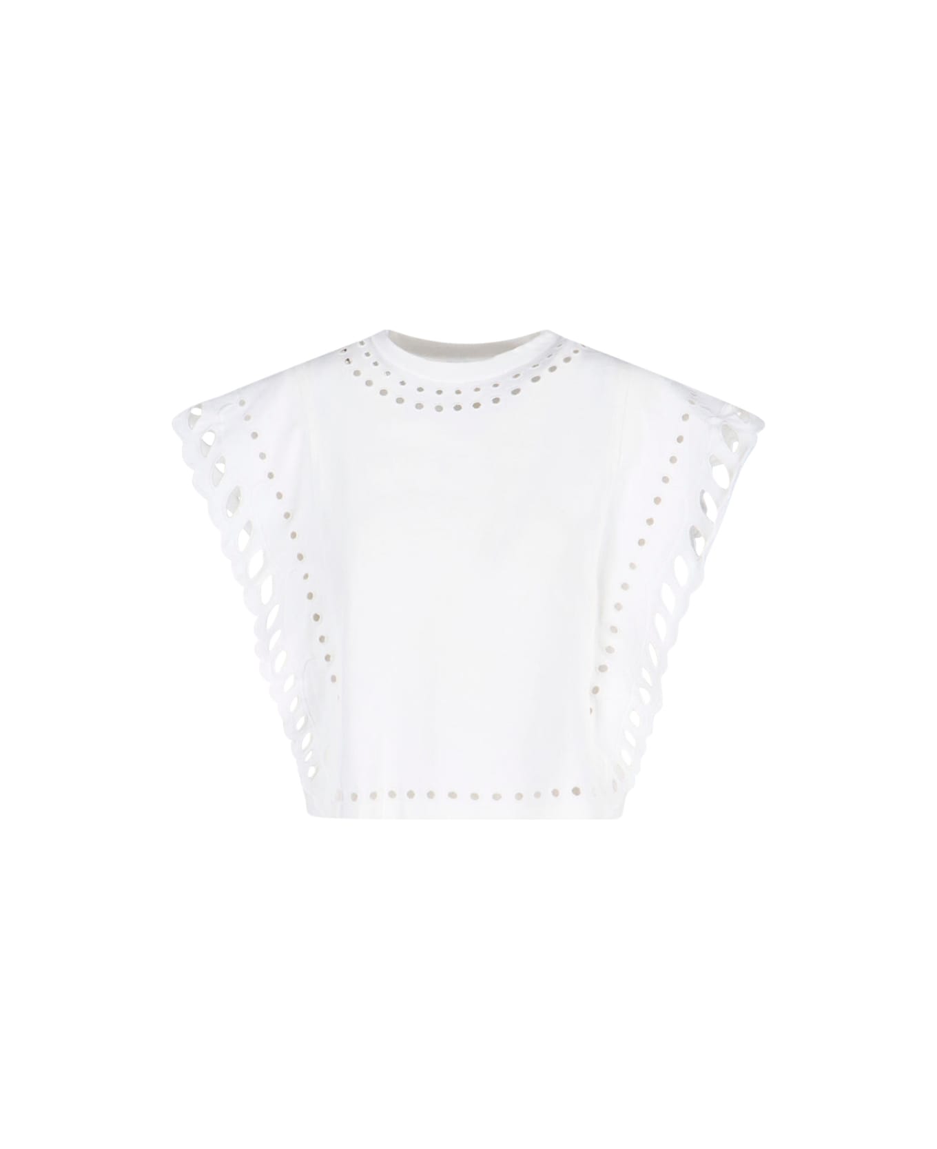 Isabel Marant étoile Odyle top in white cotton with round neckline, all-over cut-out details, and straight hem.