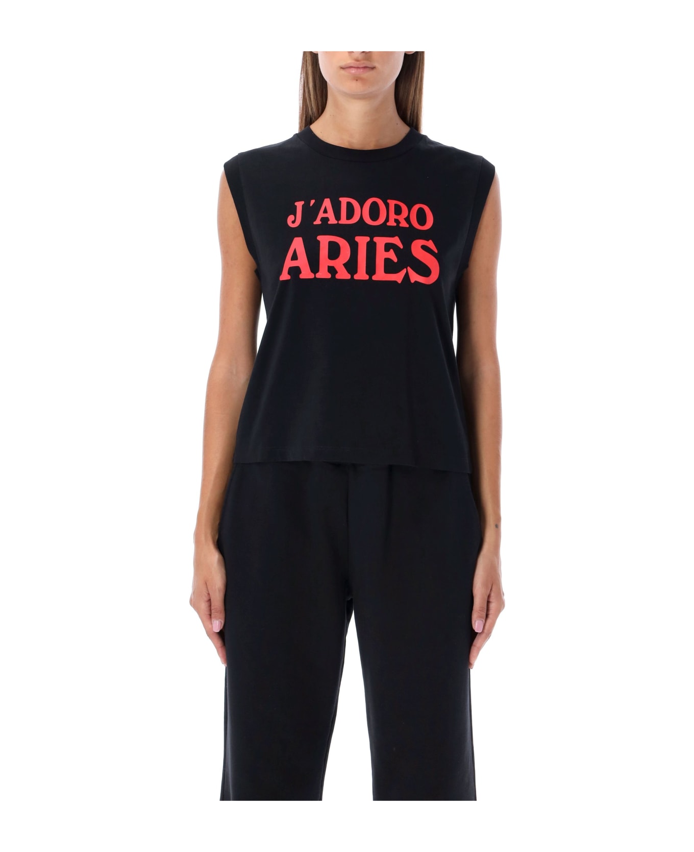 Cotton J'adoro Aries Shrunken Vest By Aries. Featuring: Ribbed Crew Neck Sleeveless Aries Seasonal J'adoro Graphic Screen Printed On Front Straight Hem The Model Is 1,72 M Tall And She's Wairing Size 3