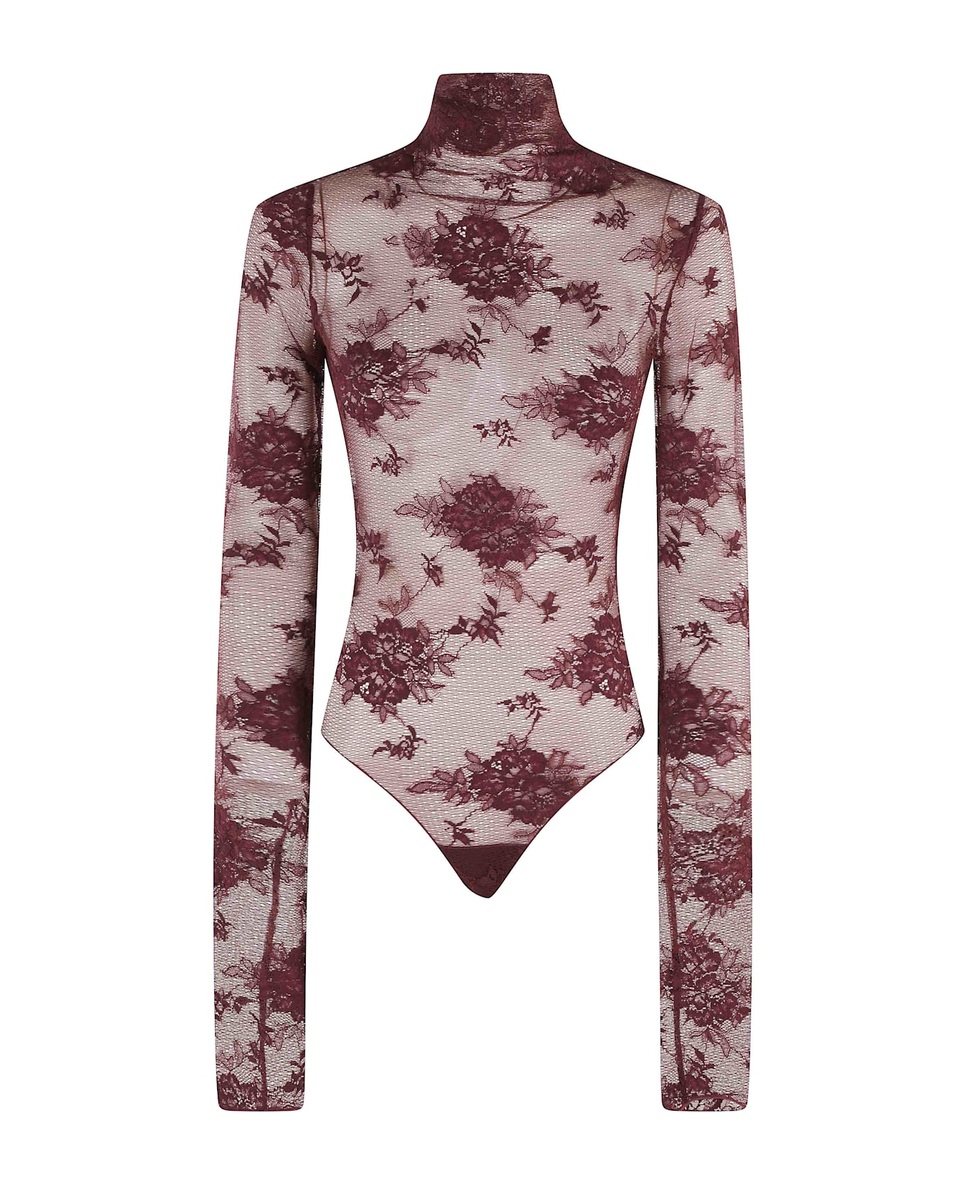 Ziggy bodysuit - The Andamane - cabernet color - lace work - high neck - long sleeves - back zipper closure - hook-and-eye bottom closure
