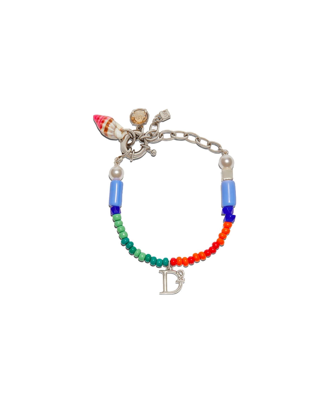 D2 Charm anklet by Dsquared2 composed of multicolor beads and silver metal, decorated with logo charm, rhinestones and shells. Snap hook closure. Length 26 cm. Composition: 30% brass, 5% shell, 40% plastic, 10% wood, 15% crystal.