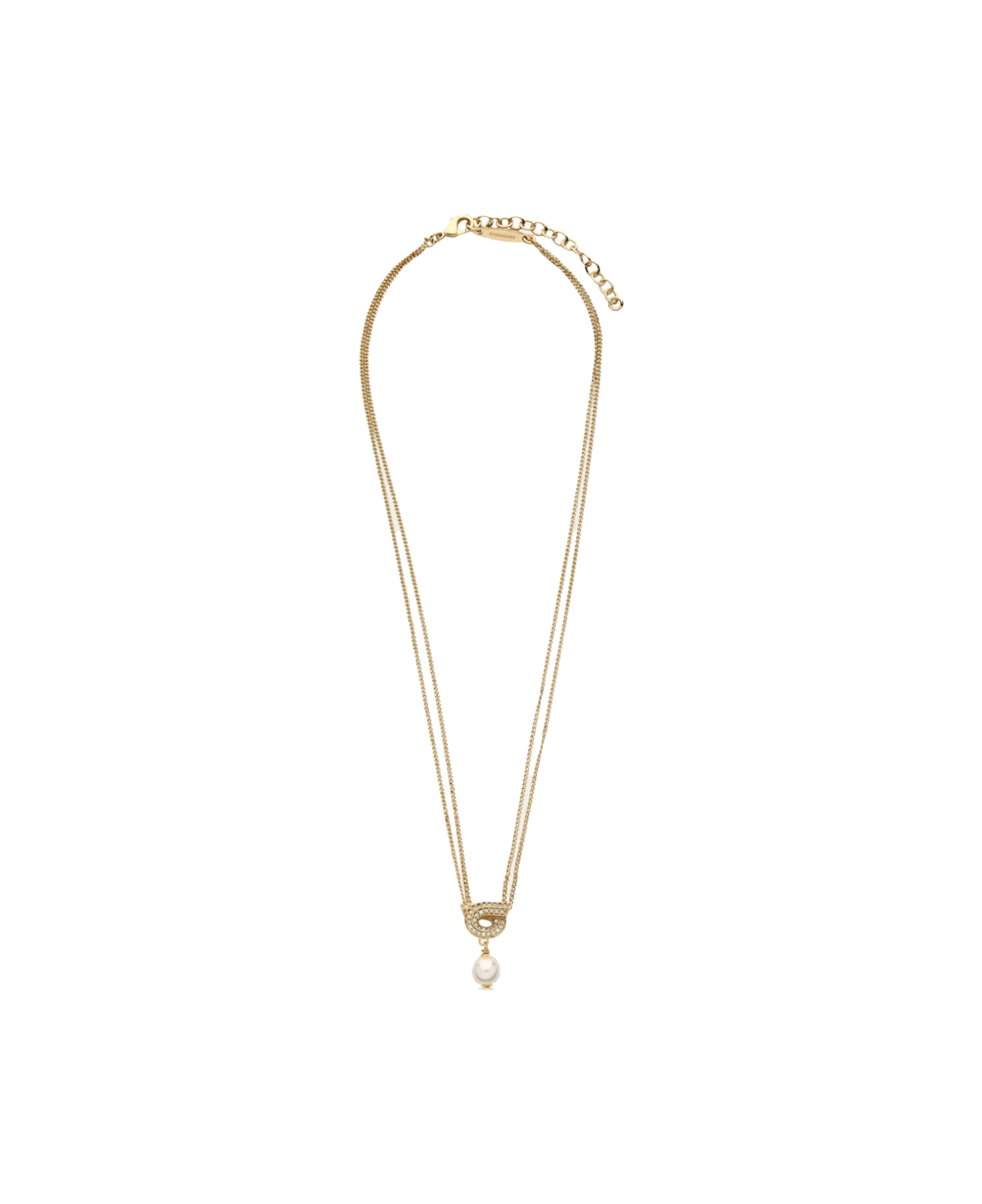Ferragamo gold Gancini neckline, hook closure, pearl and crystals detail, double detail Composition: 50% Brass, 50% Glass