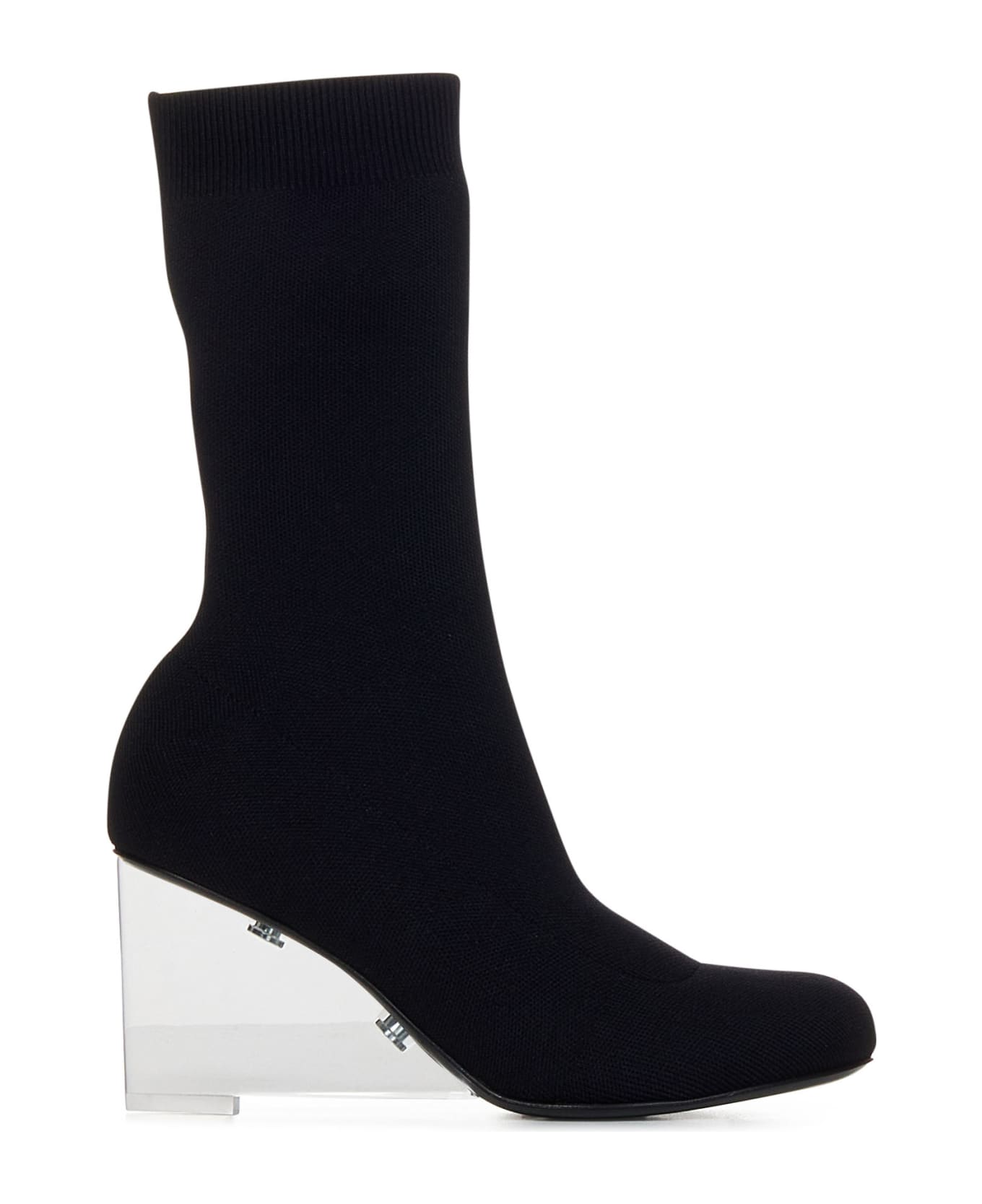 Transparent plexiglass heel, inspired by the shape of a shard which creates the illusion of floating; Seal logo on the internal pins of the heel