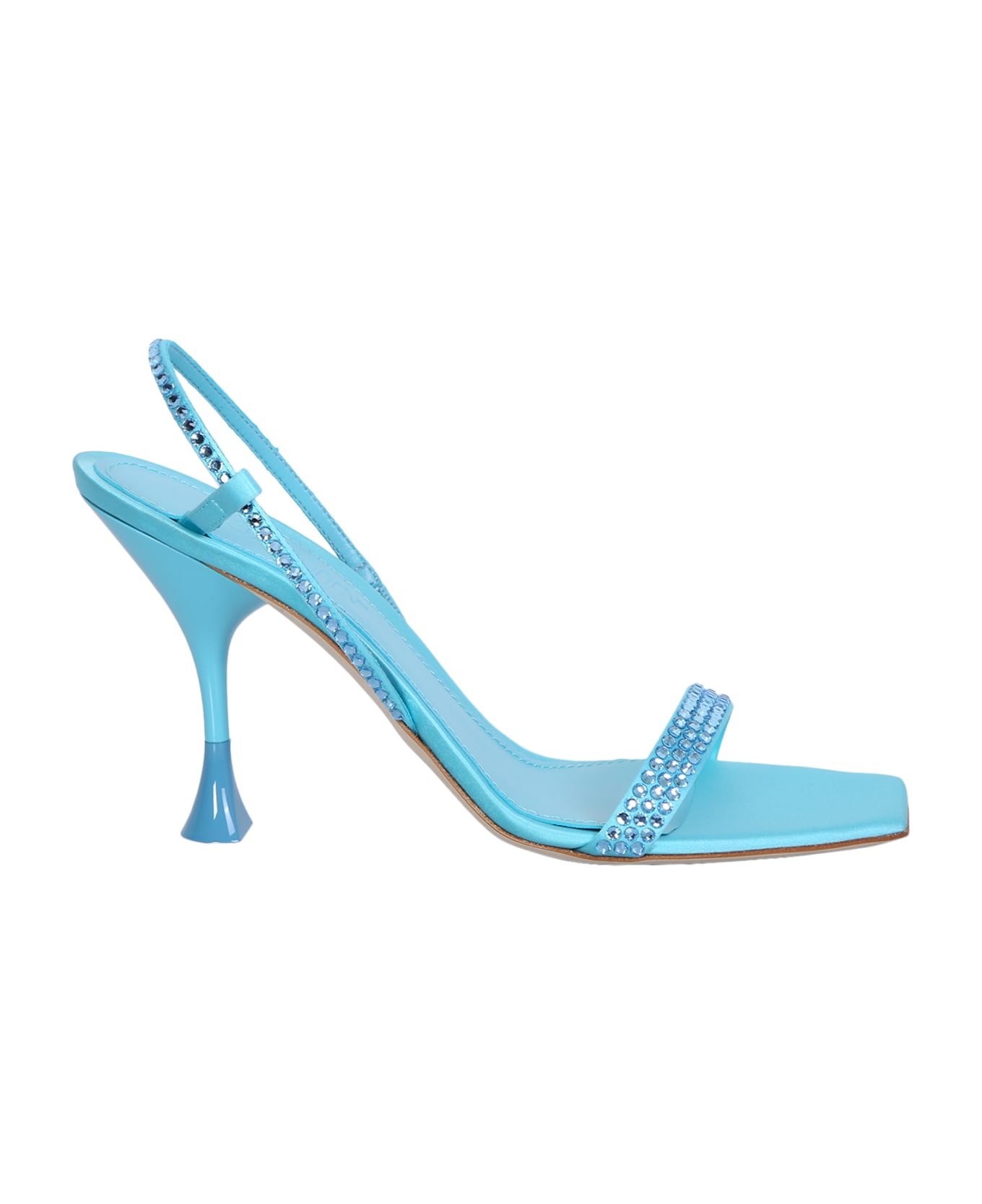 Square toe. Open toe. High sculpted heel. Bi-color heel. Slingback strap. Rhinestone details. Color: light blue
