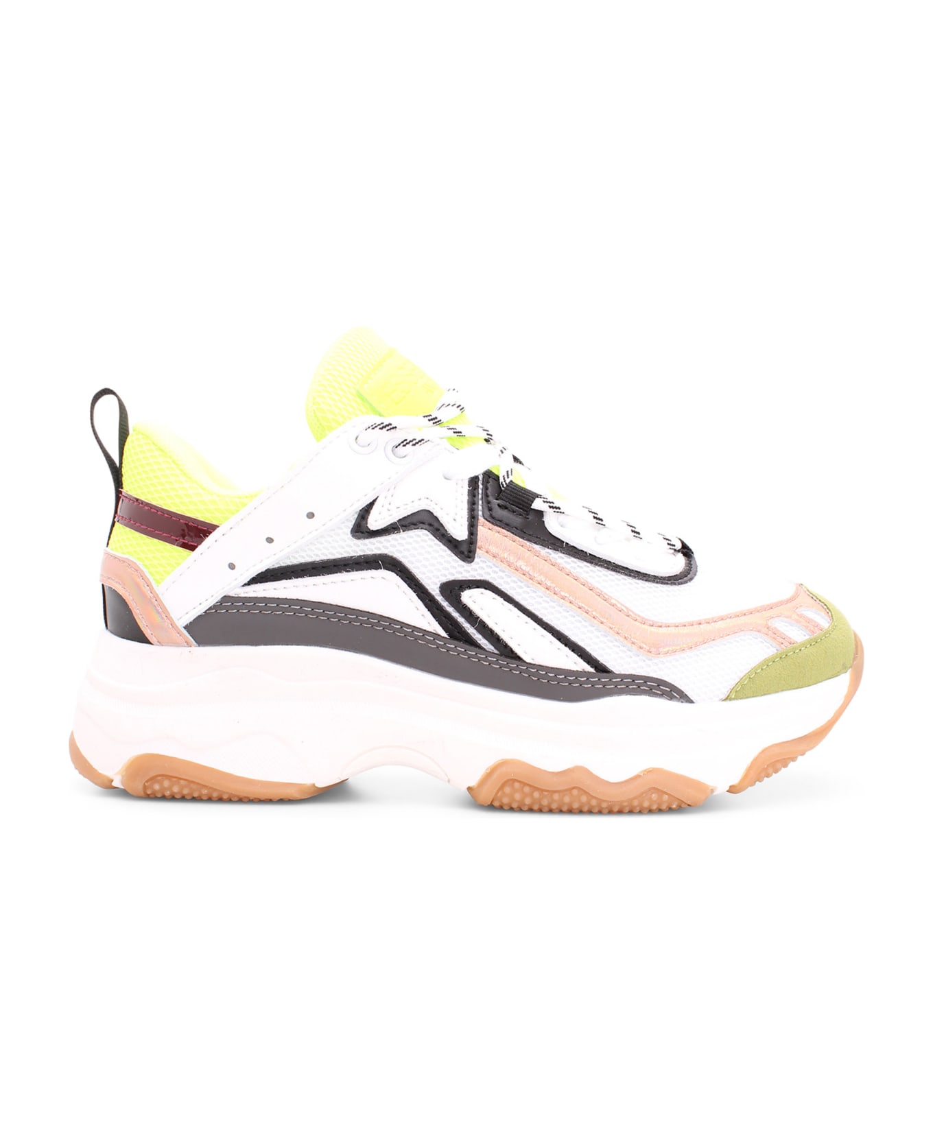 White & neon yellow  sneakers, detailed with mesh inserts, double laces and a hint of metallic-coloured and neon hues by Essentiel Antwerp