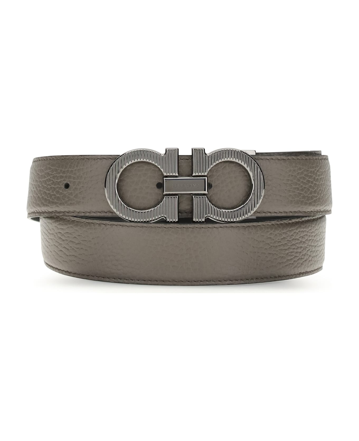 Gancini belt by ferragamo is a refined and versatile accessory made of grained leather with reversible, two-tone construction, ideal for adapting to different looks. the gancini buckle with ruthenium finish features vertical knurling, adding a touch of character to the design. adjustable in length, it offers a customized fit. a size guide is available to choose the best fit.