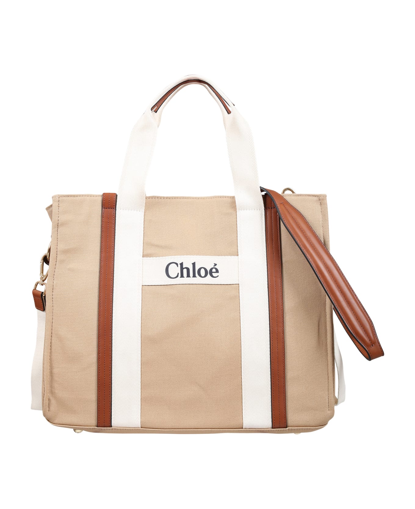 Beige changing bag, with handles, removable shoulder strap, removable inside clutch, portable changing table, side pockets and closure with inside press-stud. It s embellished with blue logo on the front.
