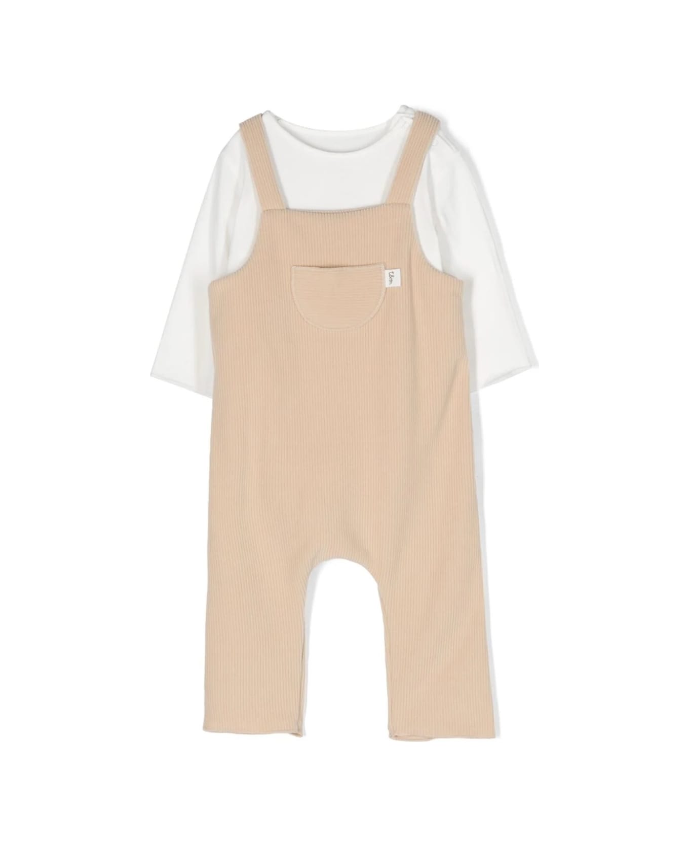 Teddy&Minou set consisting of a white body t-shirt with long sleeves and shoulder opening and a beige corduroy dungaree with front pocket and adjustable straps with buttons.