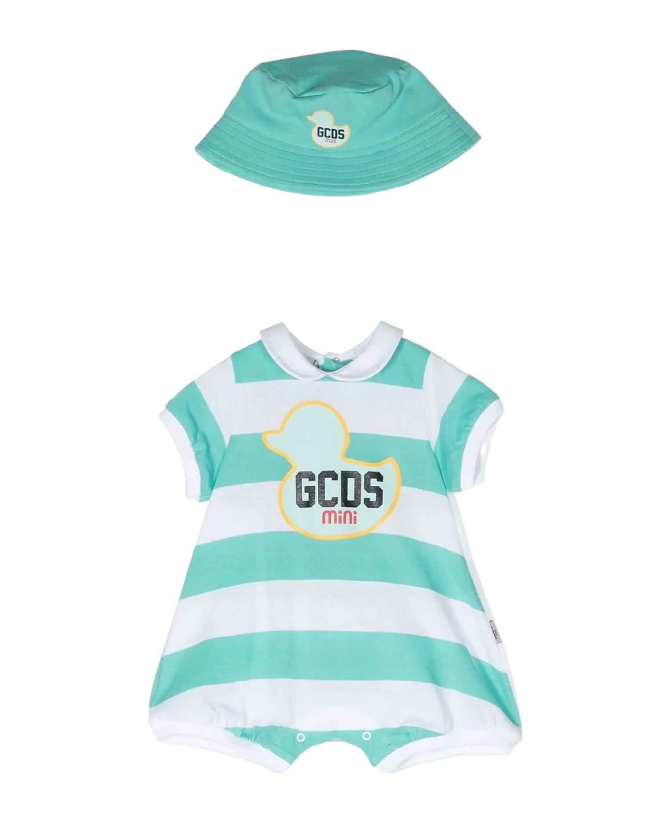 Green set baby unisex. Logo printed on the front, horizontal striped pattern, crew neck and short sleeves. 100% Cotton