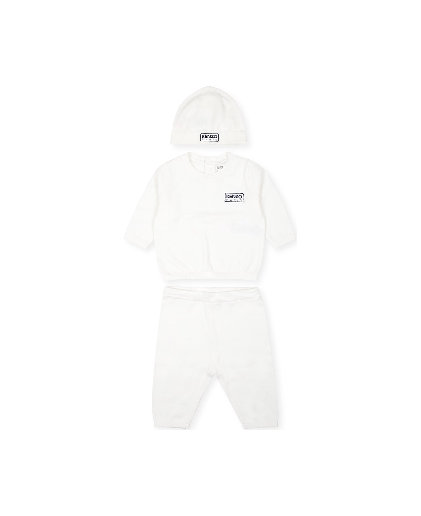 Ivory birth set from the French brand Kenzo Kids, with an urban and multicultural DNA, composed of sweater, trousers and hat, made of soft cotton and cashmere. The long-sleeved sweater features a ribbed crew neck and a convenient snap button closure at the shoulder. The trousers have an elasticated waist for maximum comfort and ribbed ankles. Elastic hat with cuff. They are embellished with an embroidered Kenzo logo.