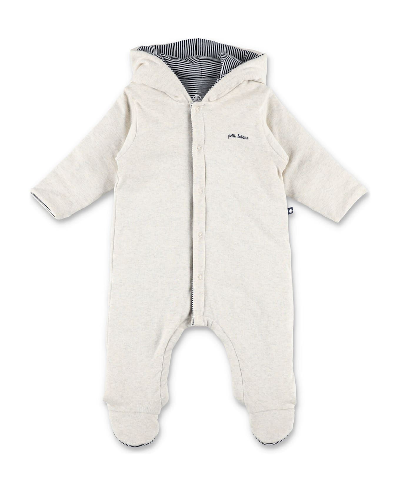 Padded Playsuit By Petit Bateau. Featuring: Stretch Rib Knit Front Snap Button Closure Hood Long Sleeves Striped Lining With Feet Logo Print At Chest