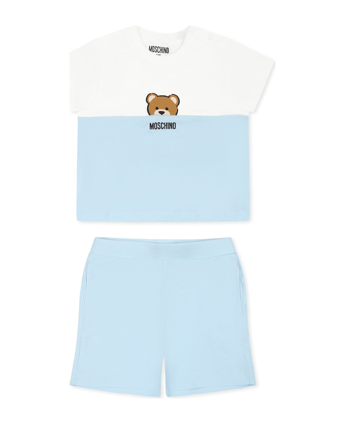 Light blue suit from the Moschino Kids brand, in organic cotton, consisting of a t-shirt and shorts. Short-sleeved t-shirt, with a crew neck and snap button closure on the shoulder. It is embellished with Teddy Bear and logo on the front. Shorts with an elasticated waist, side pockets and a pocket on the back. They are embellished with a Teddy Bear and logo on the back.