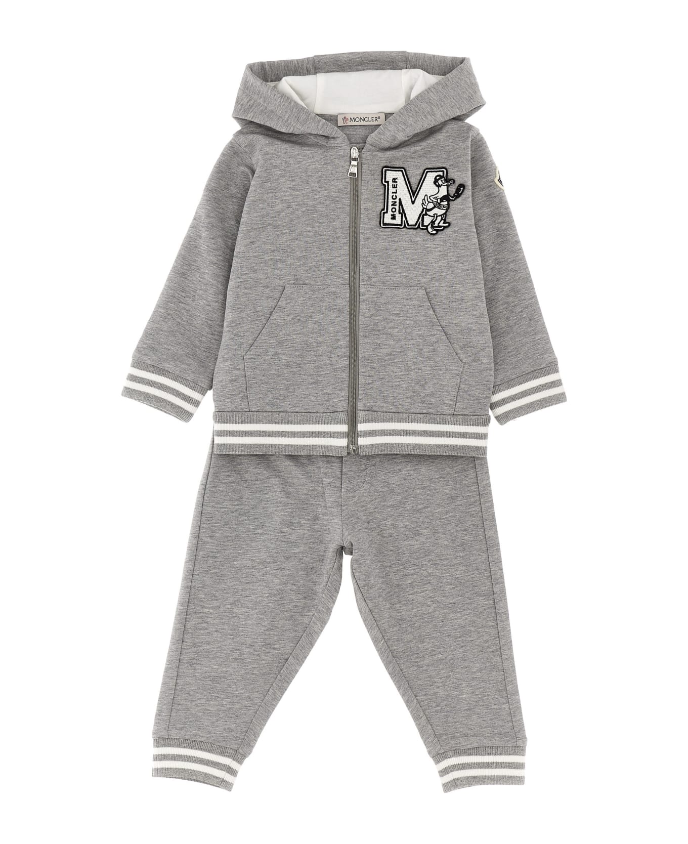 Stretch cotton tracksuit consisting of hoodie with front patch logo, zipper closure, pockets, and long sleeves with cuffs, and joggers with elastic waistband, and elastic ankle cuff.