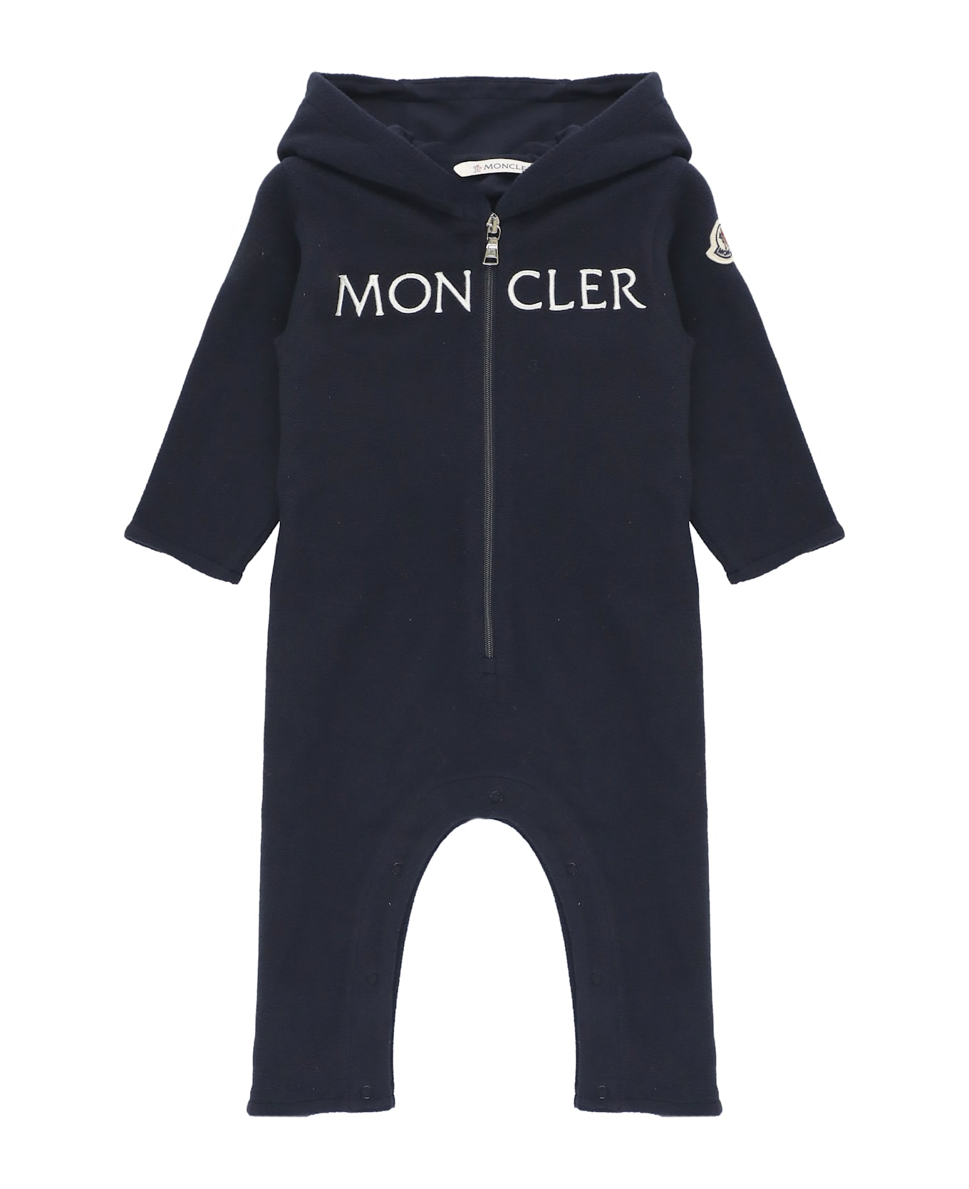 - Dark blue Moncler Baby onesie for boy - Hood - Long sleeves - Contrasting color logoed patch at left sleeve - Front zip fastening - Front contrasting color embroidered logo - Snap buttons fastening at hem