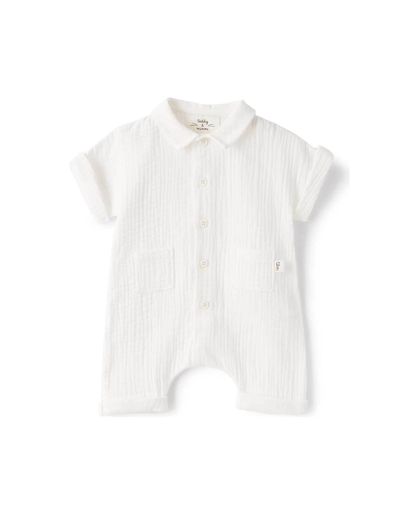 Teddy & Minou short playsuit made of milk-white organic cotton gauze and featuring a round collar, short cuffed sleeves and a front closure with tonal cotton-covered buttons. Patch pockets at the sides and logoed Teddy & Minou label detail on left side of garment.