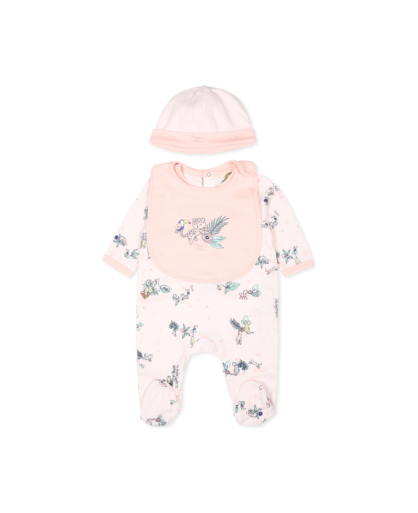 Pink babygrow set from the French brand Kenzo Kids, with an urban and multicultural DNA, composed of babygrow, bib and hat, made of soft cotton jersey. The long-sleeved babygrow features a crew neck, cozy feet, a convenient popper closure at the back and between the legs. It is embellished with floral and small all-over tiger print. Bib with side closure with automatic button, embellished with floral print and small tiger on the front. Hat with cuff, embellished with embroidered logo on the front.