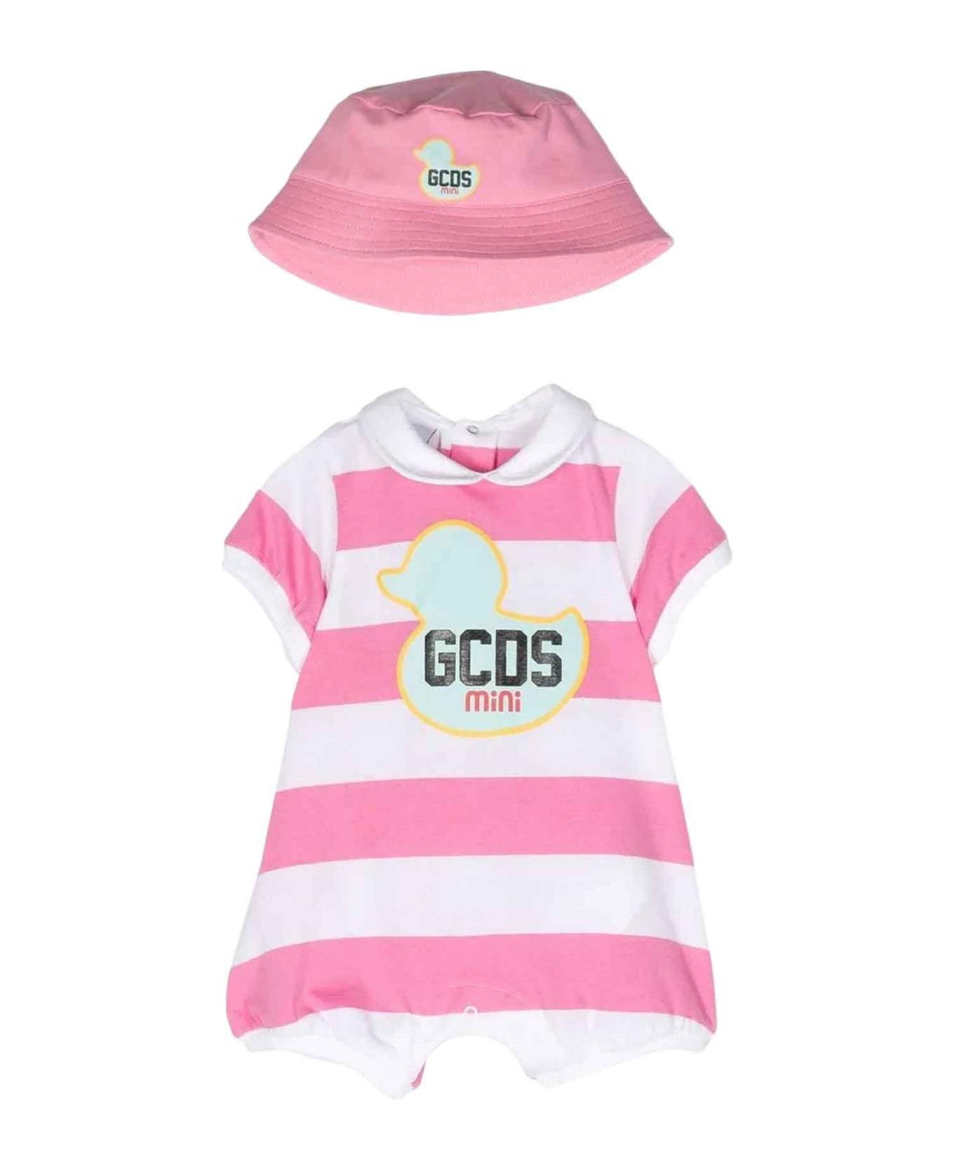 Pink set baby girl. Logo printed on the front, horizontal striped pattern, crew neck and short sleeves. 100% Cotton