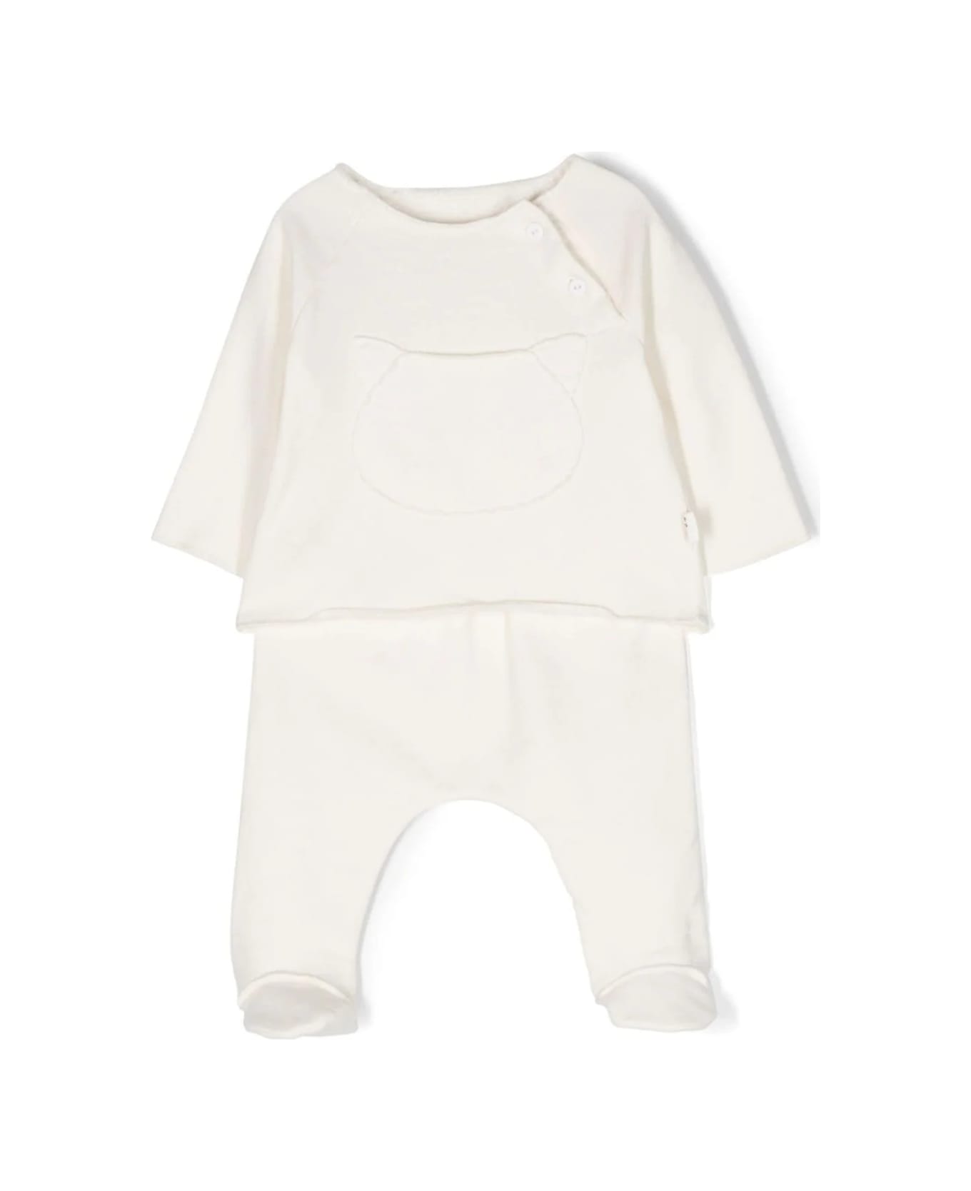 Two-piece set by Teddy&Minou in white-garment-dyed 100%-organic-cotton fleece. The t-shirt features long raglan sleeves, a side closure with tonal cotton-covered buttons and a picture of a cute cat on the front. Logoed Teddy & Minou label detail on left side of garment. The matching footed bottoms have an elasticated waist. Edges finished with tonal overlock stitching. The materials used to dye the garment are non-toxic and biodegradable.