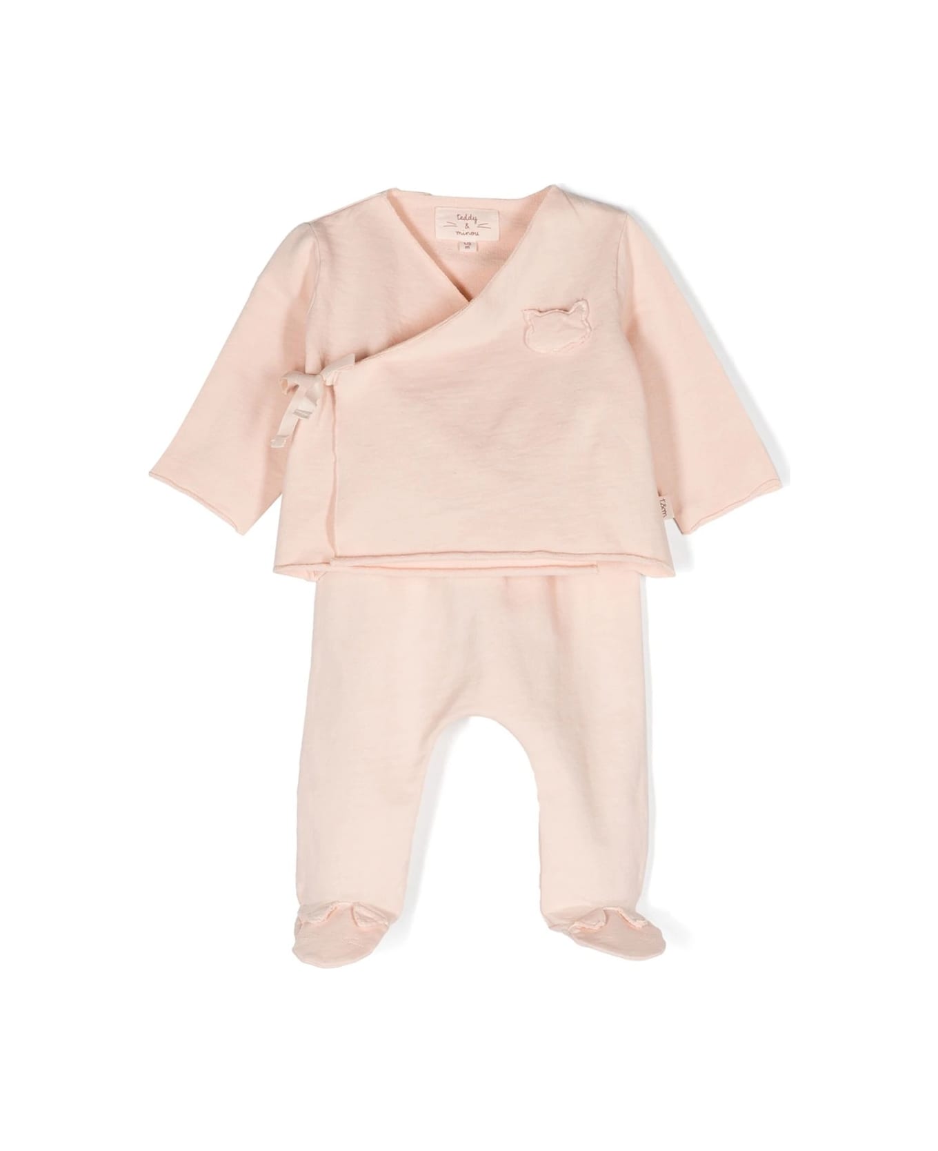 Two-piece set by Teddy & Minou made of pink organic cotton and composed of a long-sleeved shirt with a kimono closure with internal drawstring and application of a small side cat face, and trousers with elastic waistband and feet with cat ears detail. Profiles finished with color matched overlock stitching. The dyes used to dye the garment are non-toxic and biodegradable.