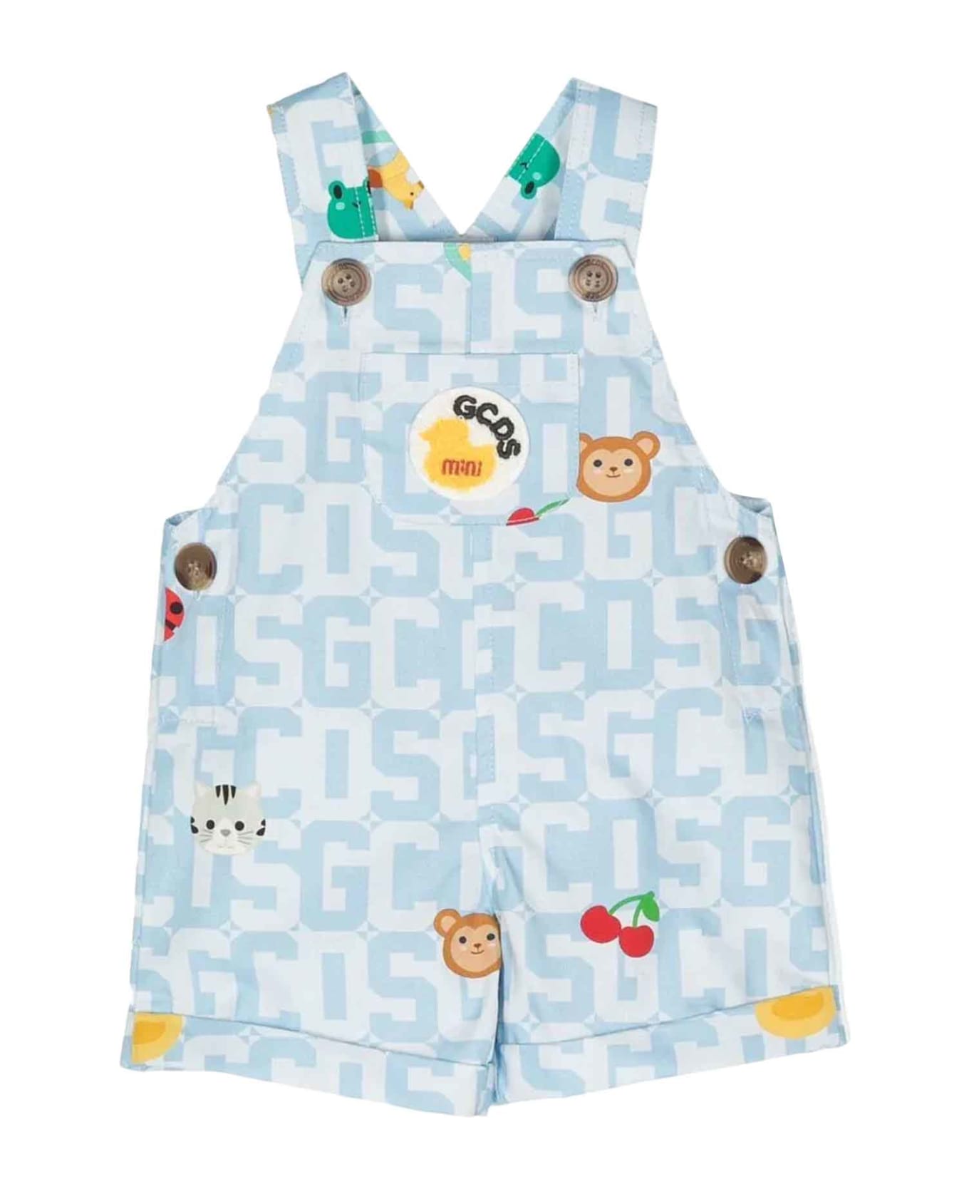 white/light blue dungarees baby boy. Monogram motif, applique detail, square neckline and sleeveless. 100% Cotton
