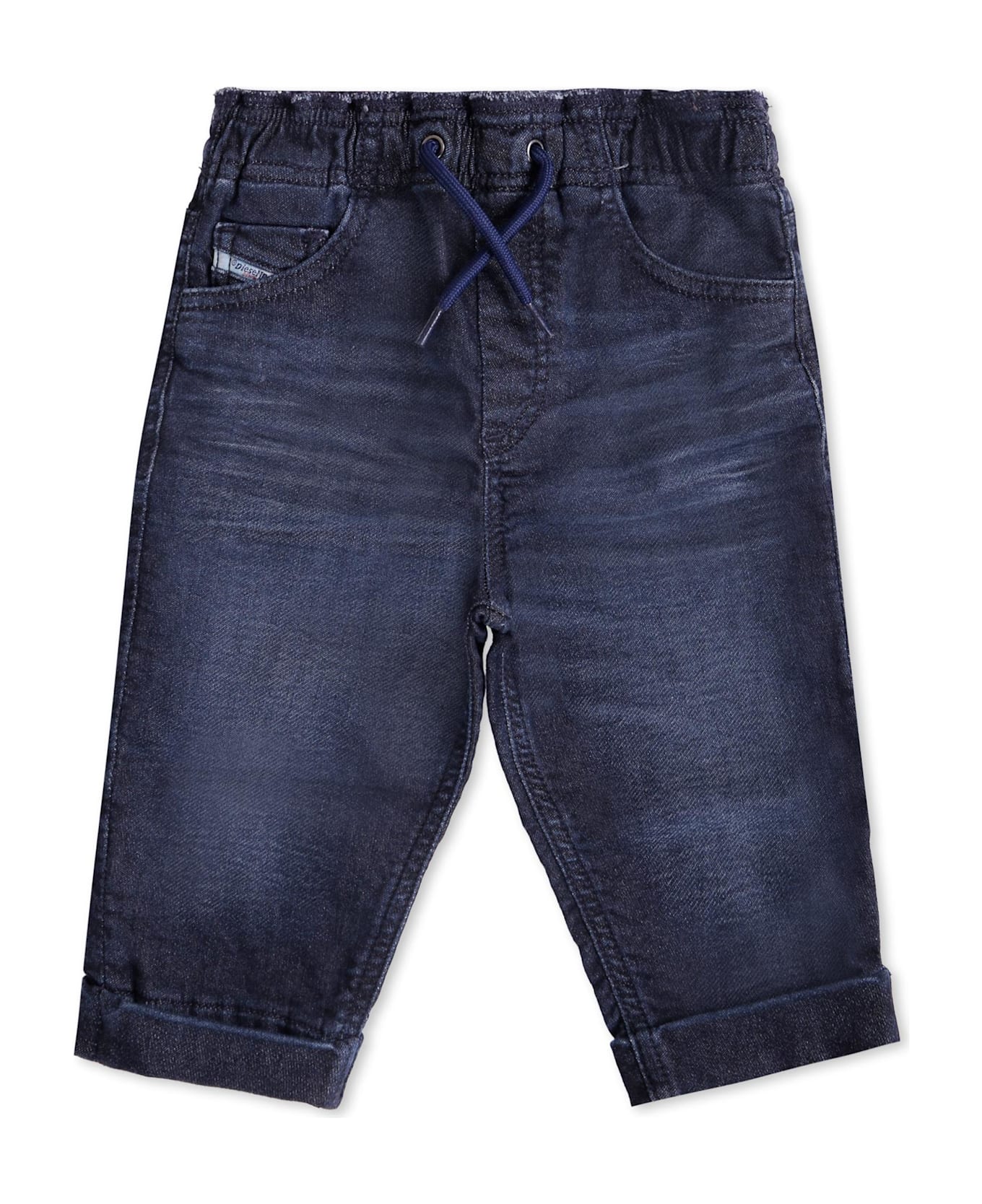 Denim jeans, five pockets, with whiskers on the front, elasticated waist, drawstring and cuffed hem. They are embellished with a logo patch on the front and an embroidered logo on the back.