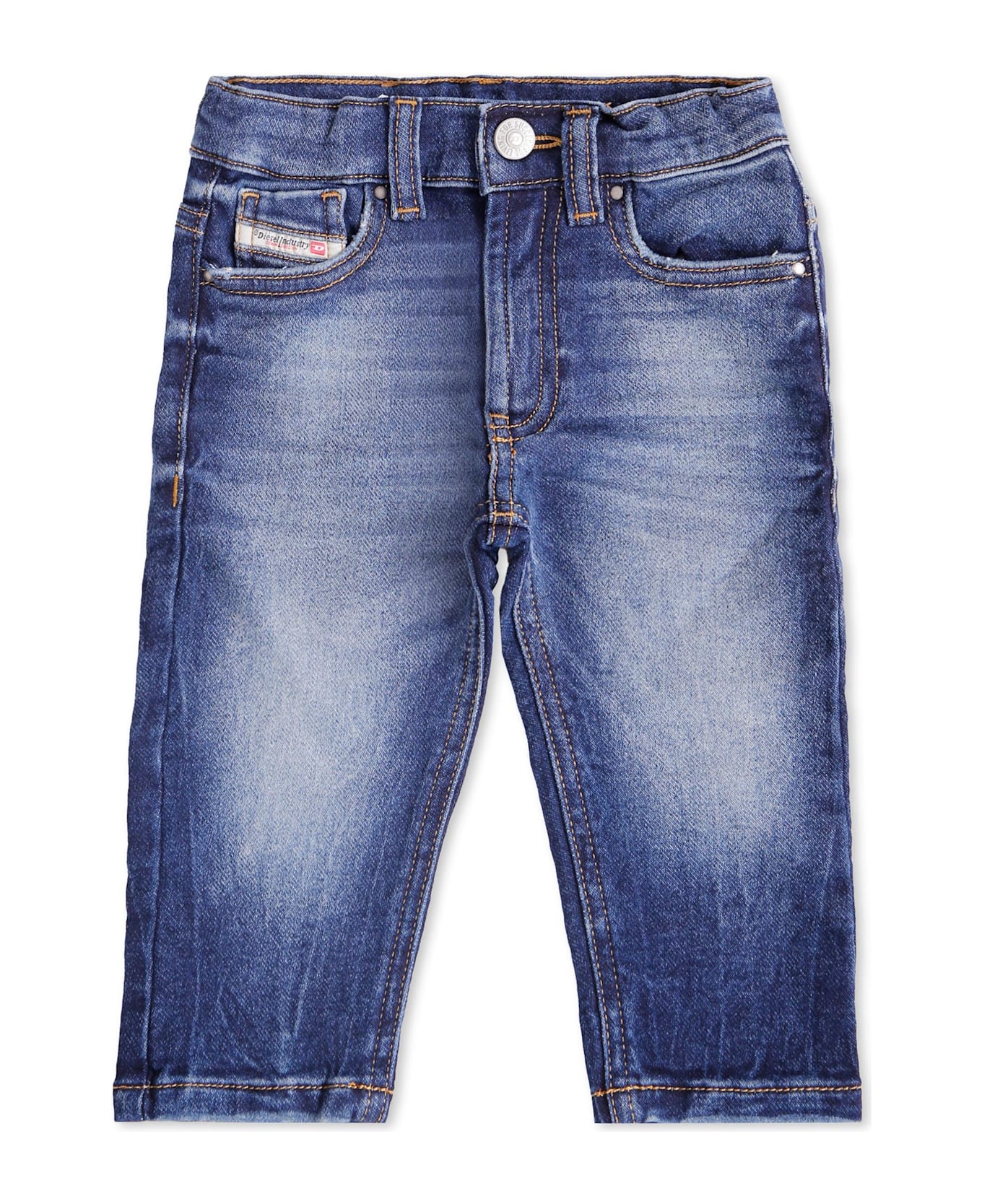 Five-pocket denim jeans, with whiskers on the front, front zip and snap button fastening, and adjustable waist thanks to an internal elastic with buttons. They are embellished with logo patches on the front and back.