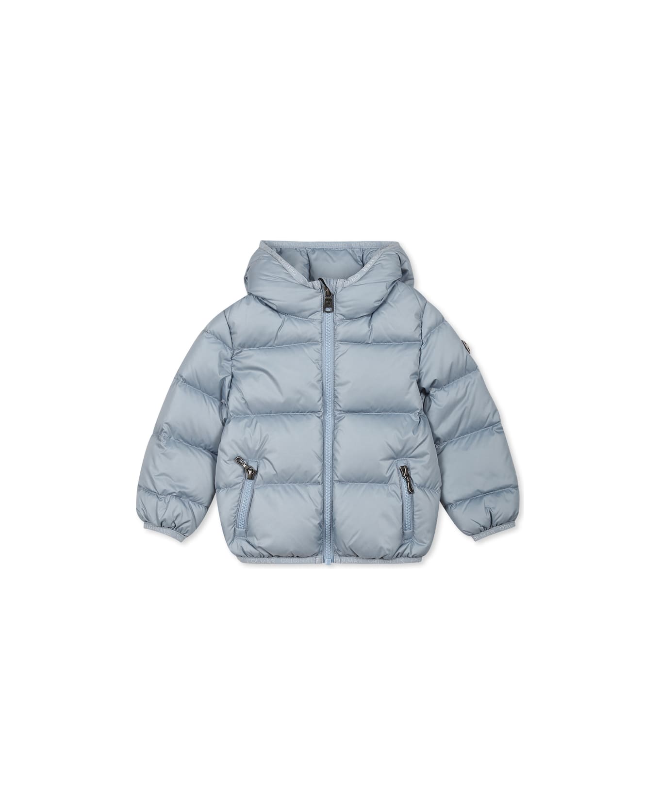 Lightly padded and quilted light blue down jacket, long sleeves, with hood, front zip fastening, side zip pockets, elasticated cuffs and hem. It is embellished with rubberized logo on the sleeve.