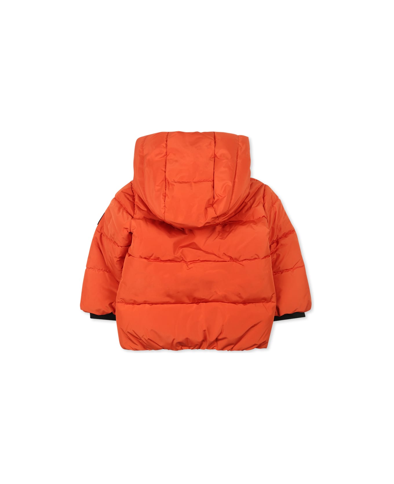 Heavyweight, padded and quilted, waterproof, orange down jacket, long sleeves, with fleece-lined hood, front zip fastening, side pockets and ribbed cuffs; made from recycled polyester. It is decorated with a contrasting logo print on the chest, logo band and logo inside the hood and logo patch on the sleeve.