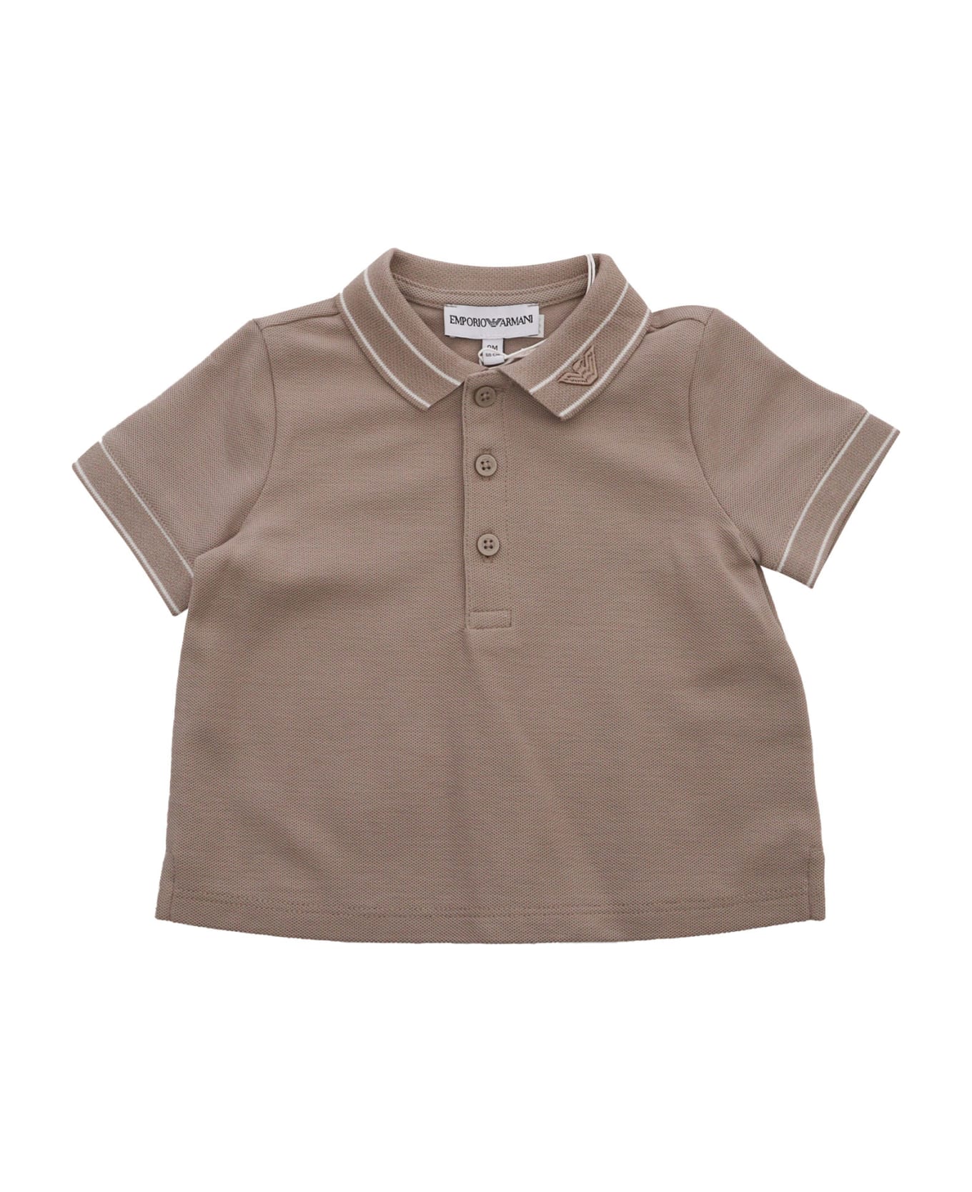 Brown polo shirt with Armani logo on the collar, white stripes detail, small buttons. Composition: 100% COTTON