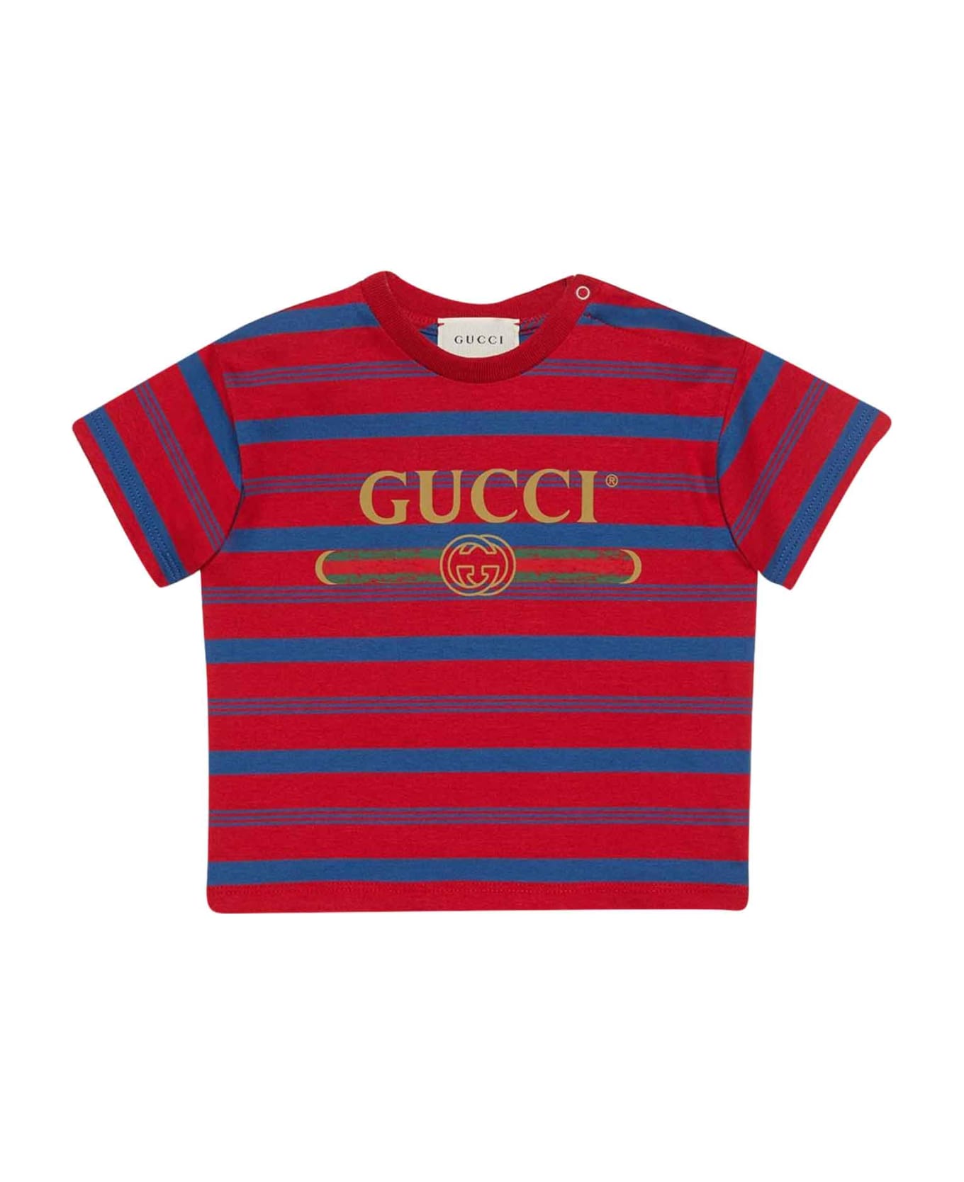 T-shirt with blue and red stripes, frontal logo press, round neck and straight hem