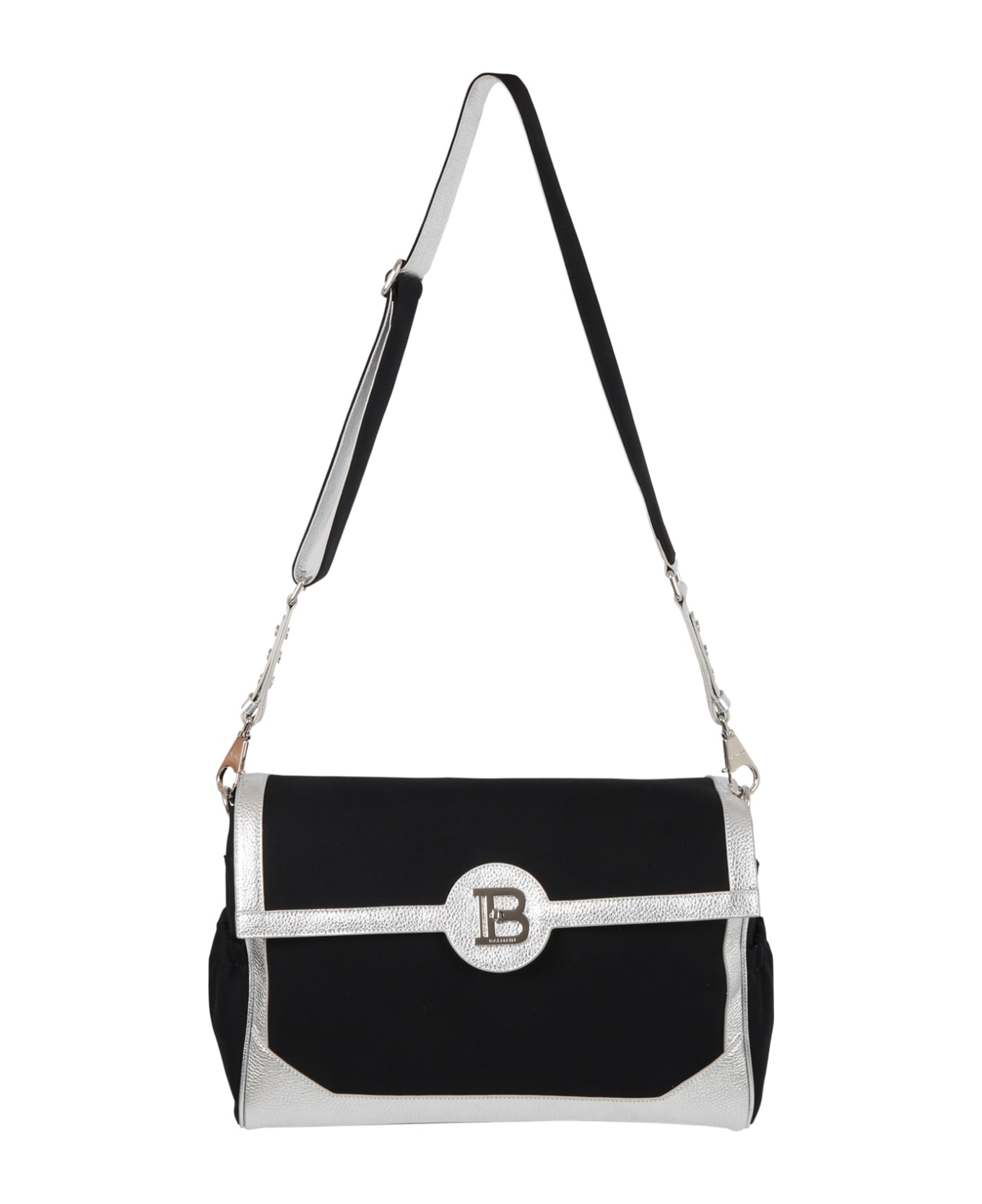 Black changing bag, with press-stud closure on the front, side pockets, black shoulder strap and internal changing mat. It is embellished with silver piping and iconic B on the front.